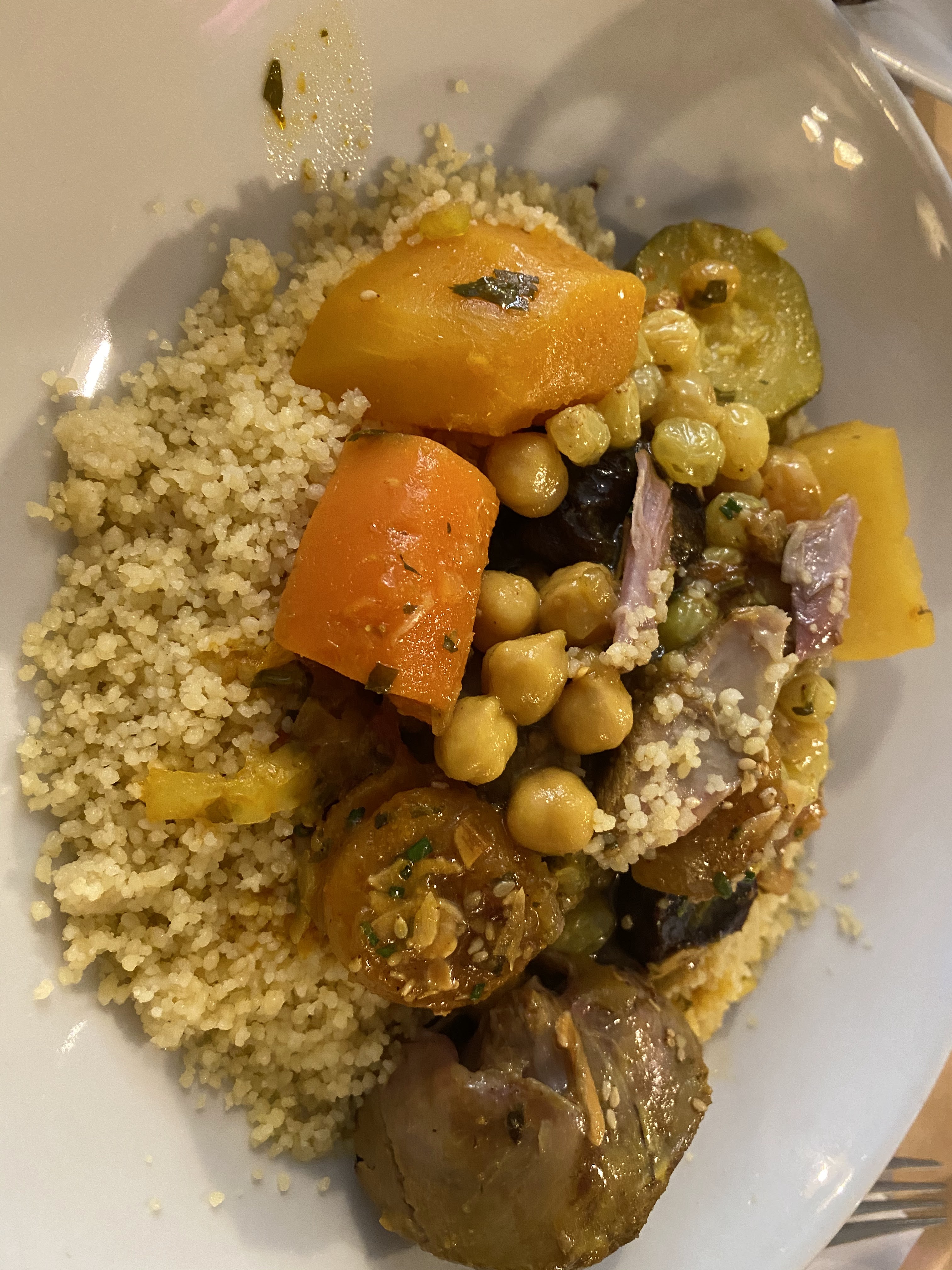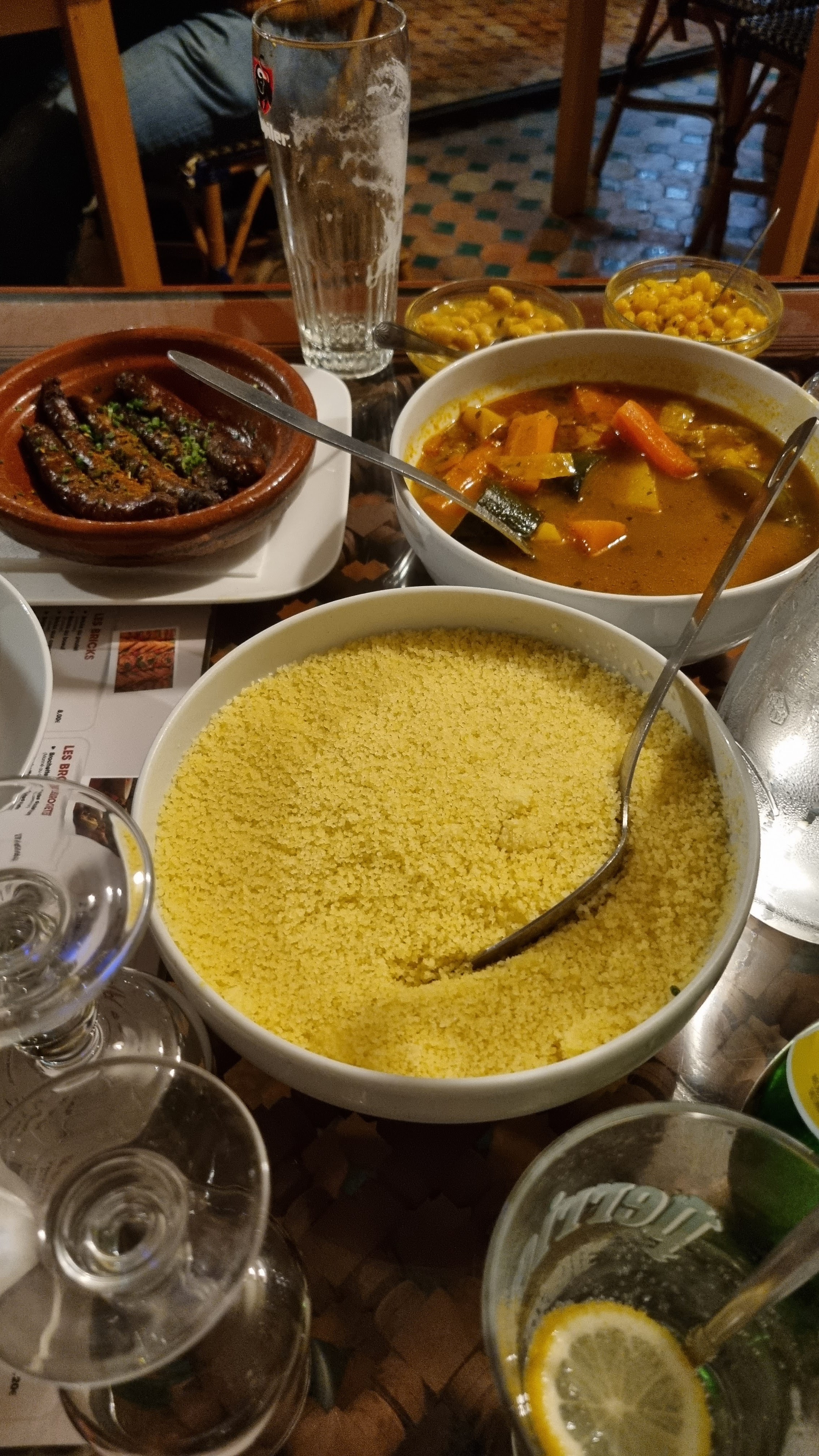 Plats très bons et copieux. Les couscous sont servis en parti dans des plats communs et séparés (semoule, légumes pois chiches etc.) ce qui permet de se servir la quantité que l'on souhaite et de ne pas prendre ce que l'on aime pas. Le cadre est très joli, et le personnel très sympathique. À tester !