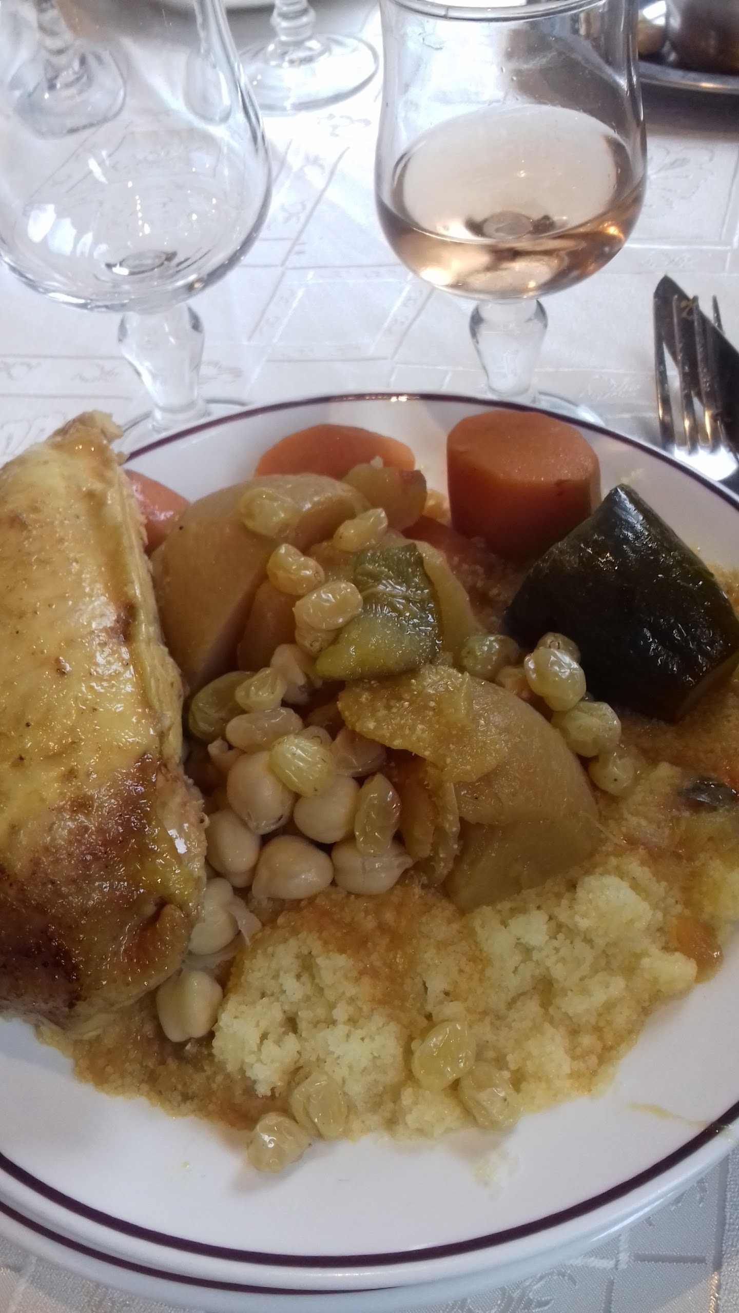 Pas le meilleur des couscous. Nous sommes venus à 4 et nous avons pris un formule midi. Dans la formule, il y avait un verre de vin, ne buvant pas d alcool nous avons demandé si nous pouvions prendre un soft à la place.... la réponse était catégorique non c est pas possible. Je trouve que ce n est pas commerçant du tout ! Et pour finir, nous avions le droit à 2 pâtisseries au choix et celles-ci nous ont été imposées... Ce n est pas un restaurant où nous reviendrons.