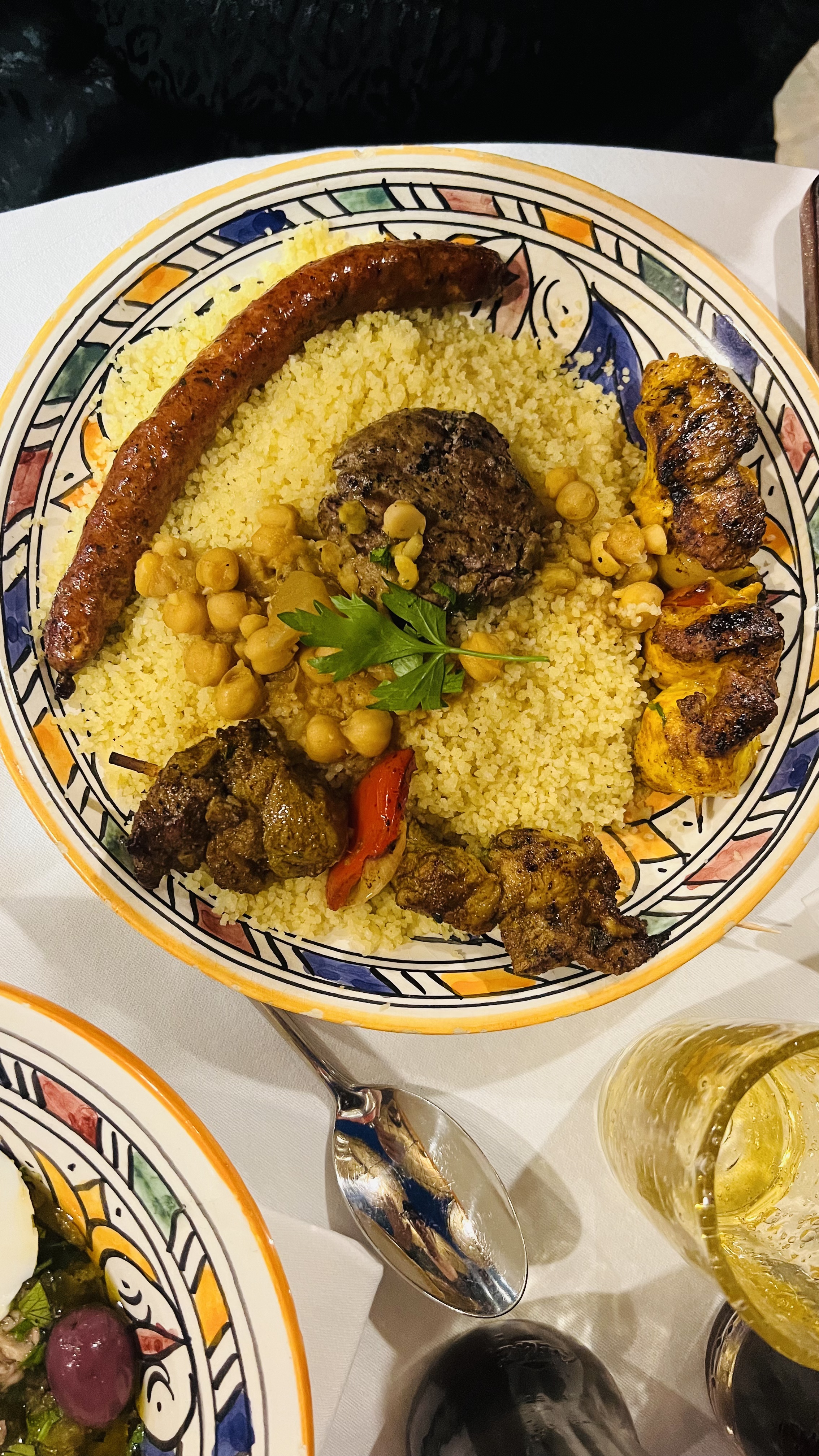 Un accueil sympathique, un cadre et de la propreté, une ambiance avec danseuse super et pourtant une note de ⭐⭐ Les photos des plats sont trompeuses. Nous avons commandé un coucous royale et avons été déçu 😞 non pas par le goût et la qualité des produits mais plutôt par l'idée que nous nous en étions faite. 1 brochette d'agneau 1 de poulet et 2 merguez. Nous avons déjà connu mieux à 36 euros le royale; un prix véritablement excessif au regard du plat. Toutefois, nous reviendrons pour ne pas rester sur une déception et donner une nouvelle chance à ce très joli restaurant qui cherche visiblement à adapter sa vitesse de croisière. En attente de votre réponse Cordialement