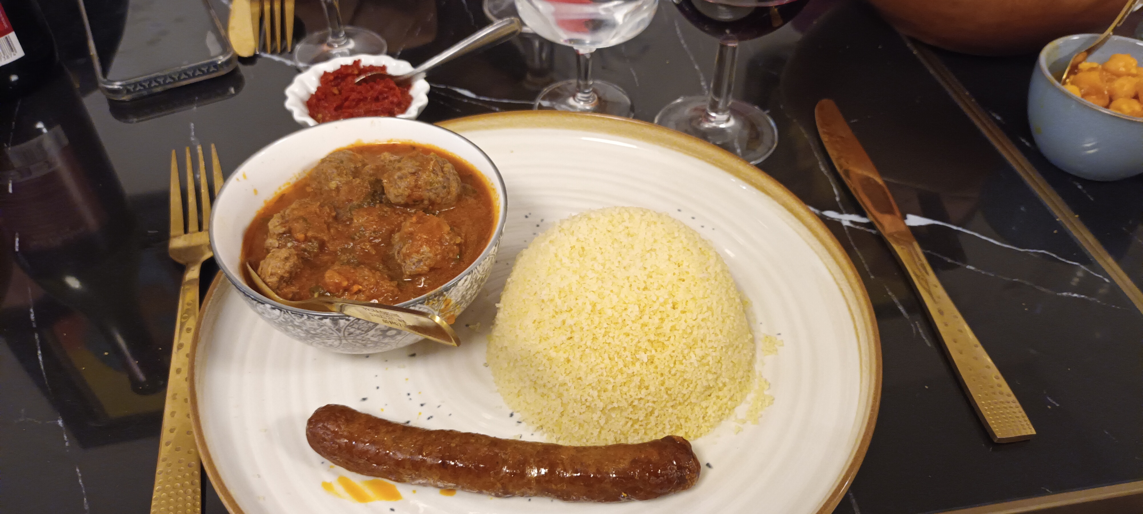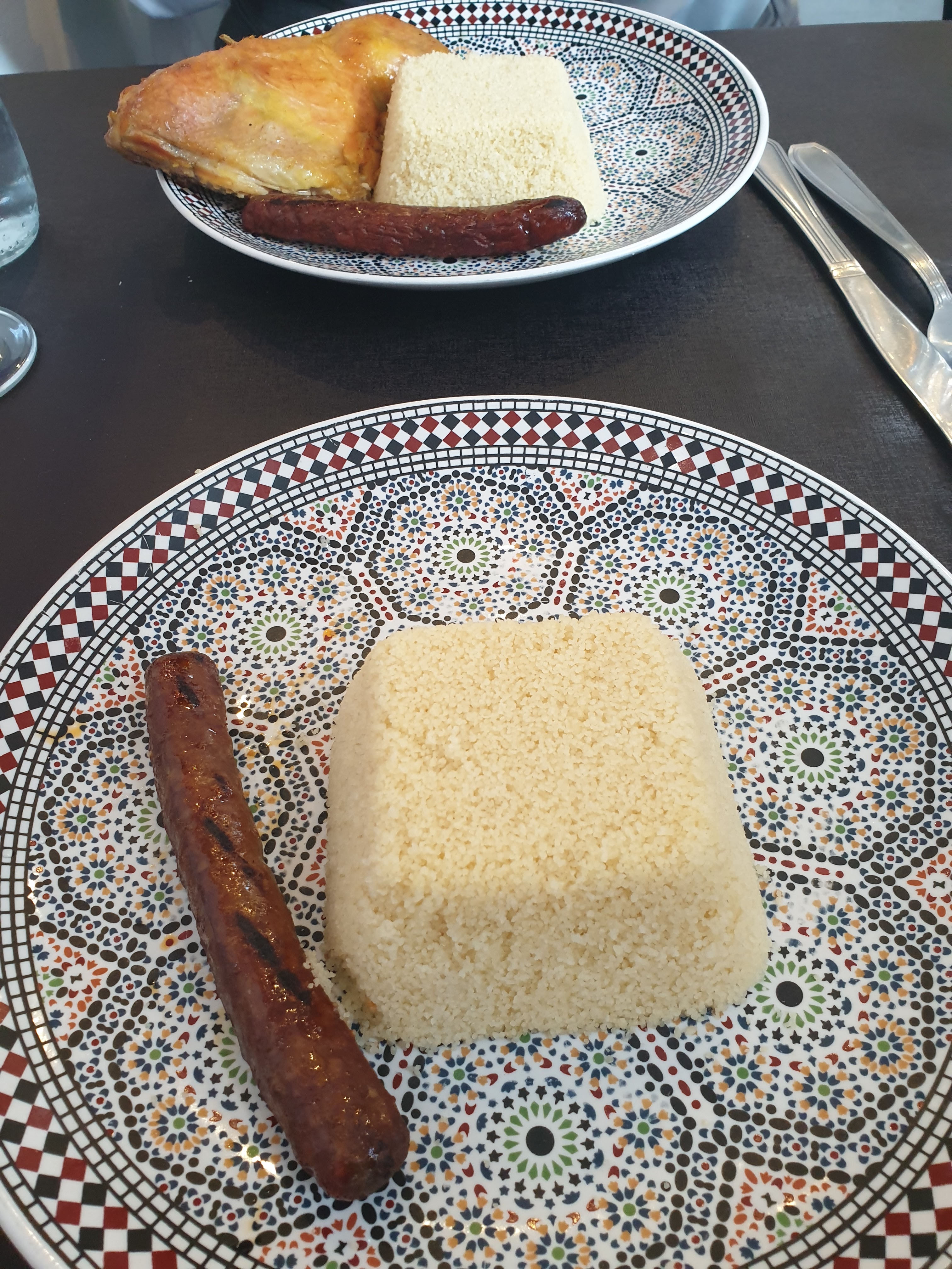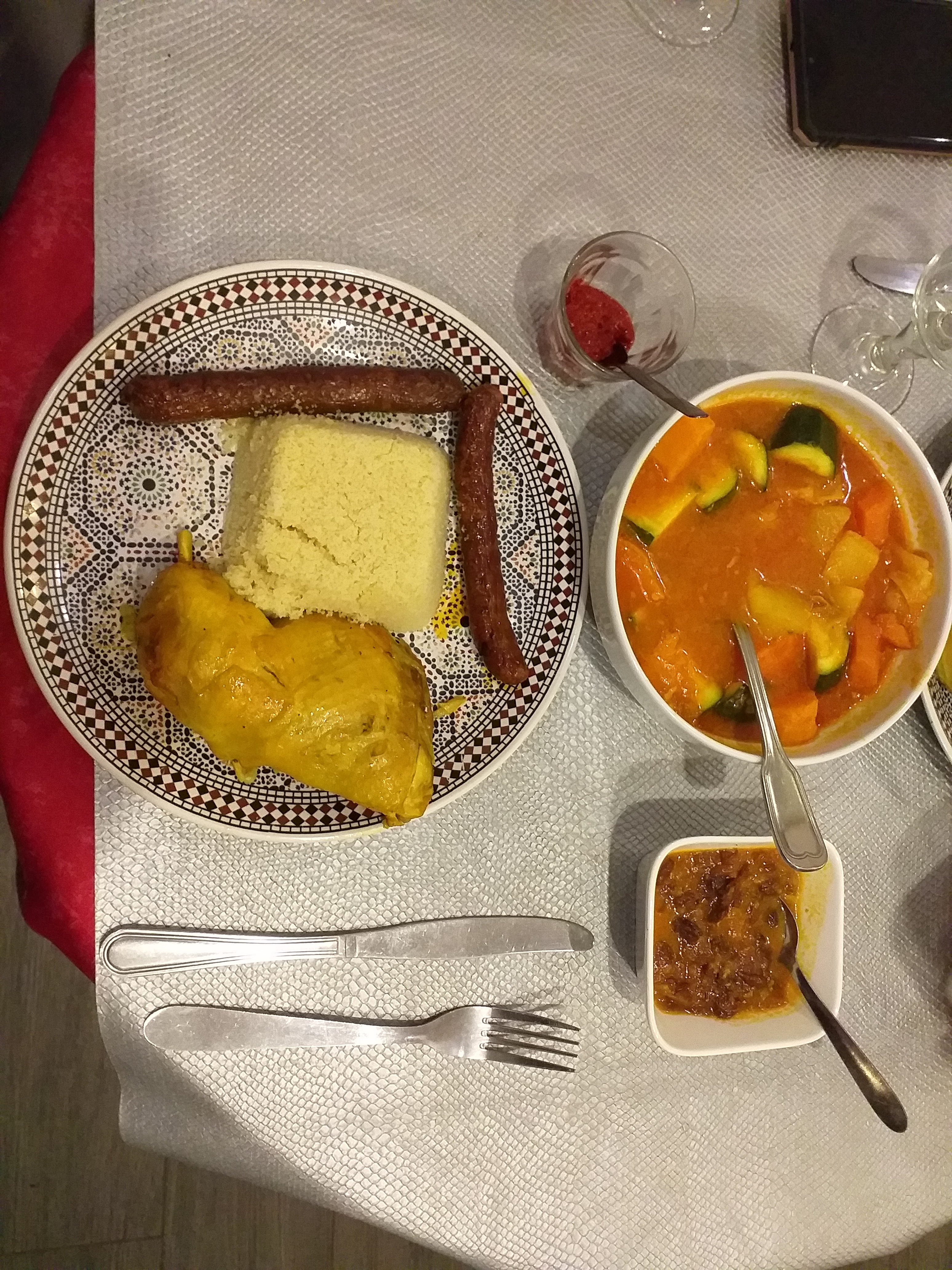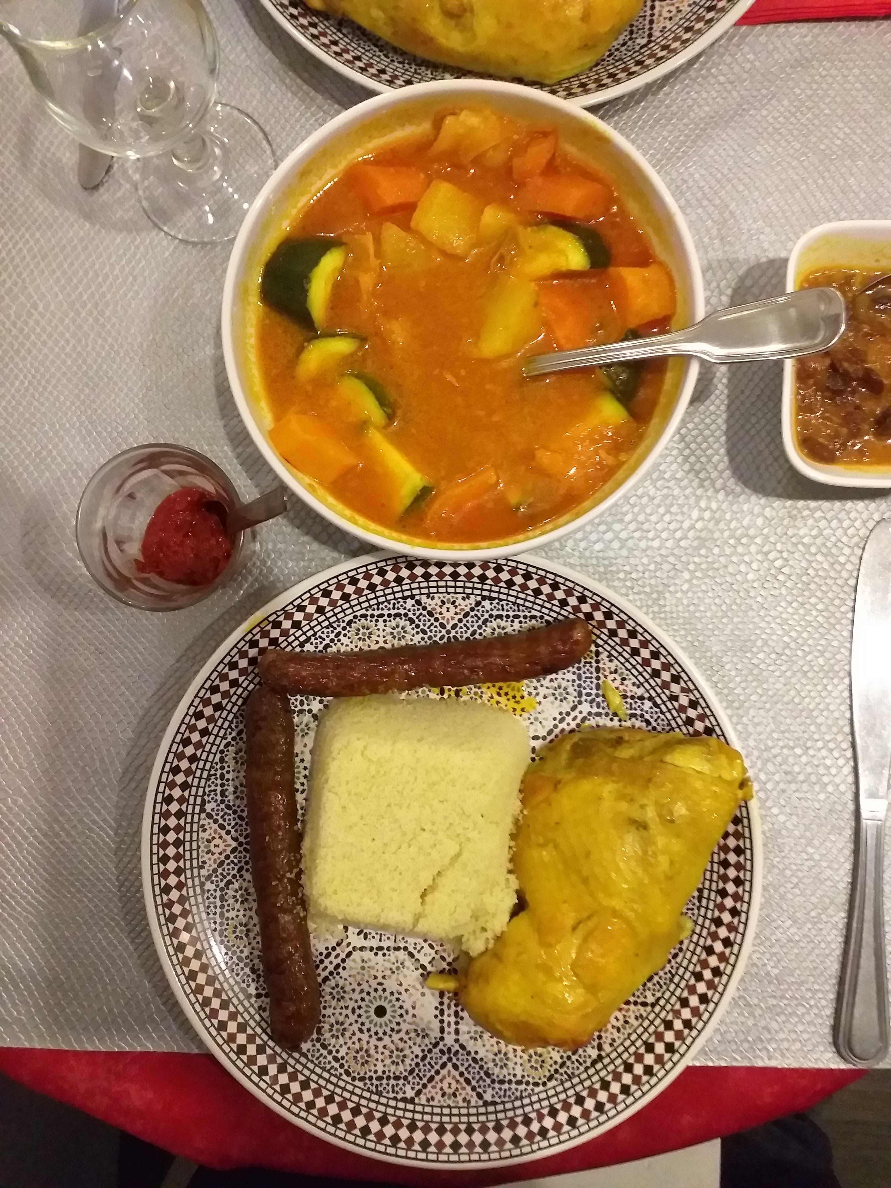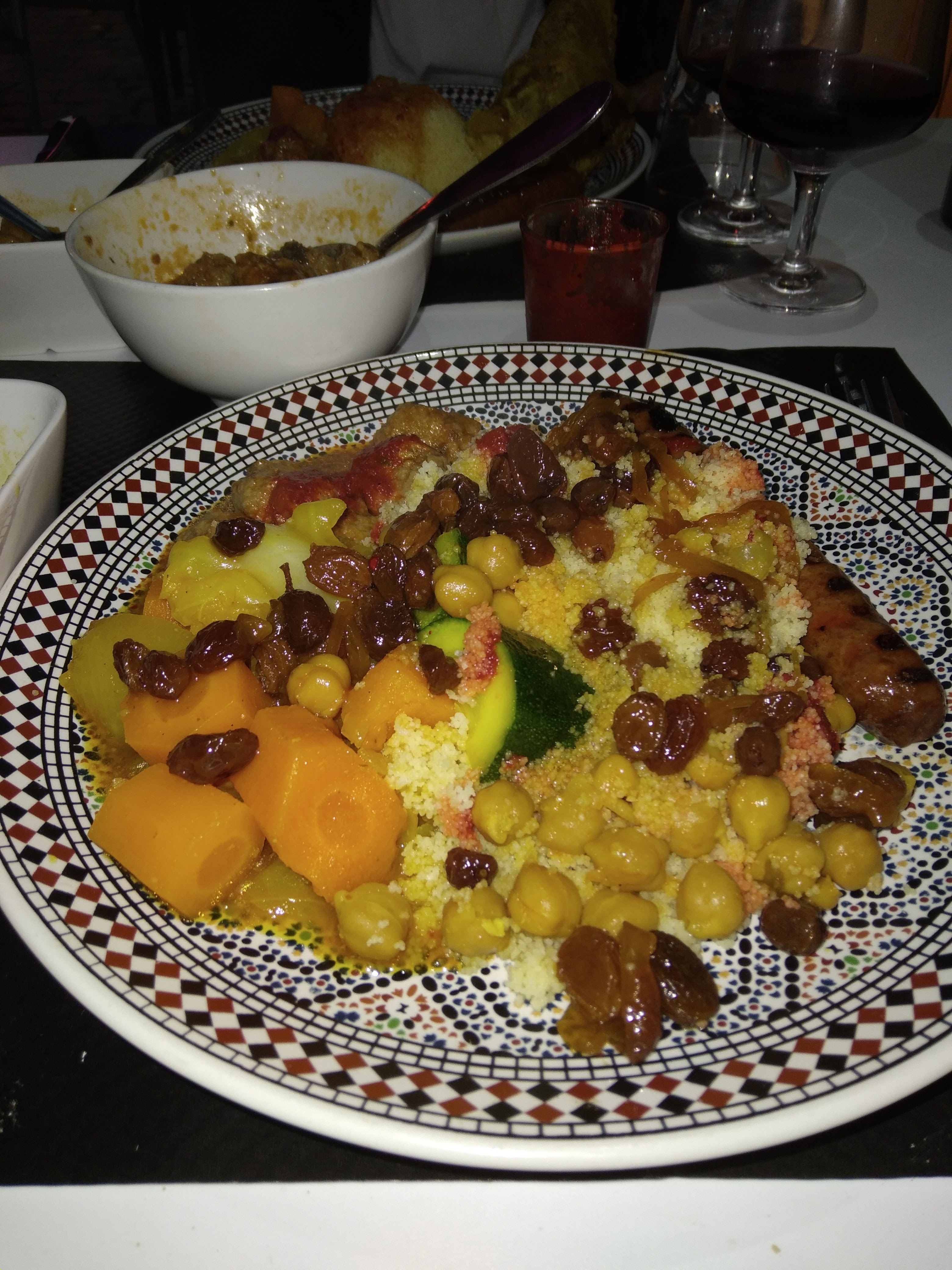 Accueil très sympathique, Nous avons pris deux couscous merguez poulet et merguez boulettes, rien a dire c'est copieux bien cuisiné et tout simplement délicieux .. Le serveur nous propose meme de nous resservir en semoule et légumes Nous avons aussi pris un vin marocain très bon et très bien conseillé par le serveur Et au final nous nous sommes laissé tenté par des pâtisseries orientales tout simplement un régal A refaire et une adresse a conseiller Prochaine étape tester le tajine !!!