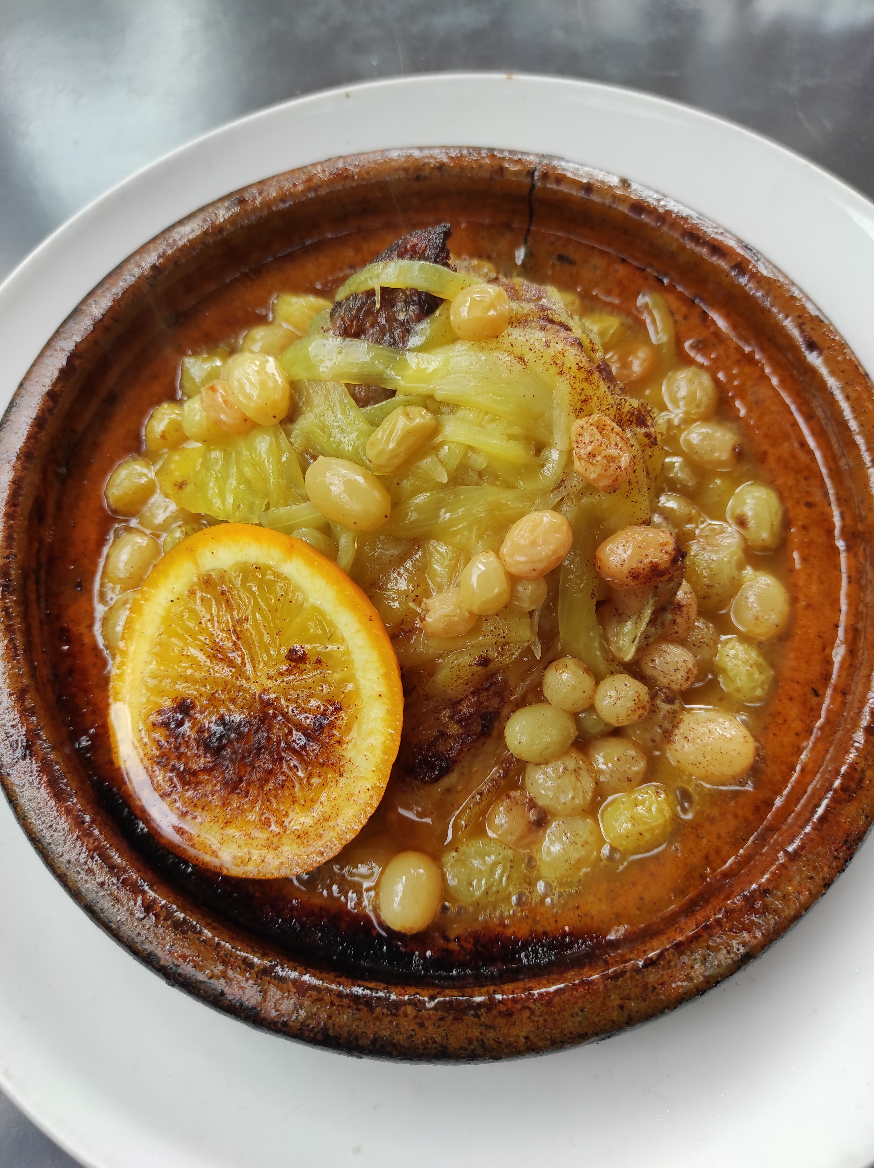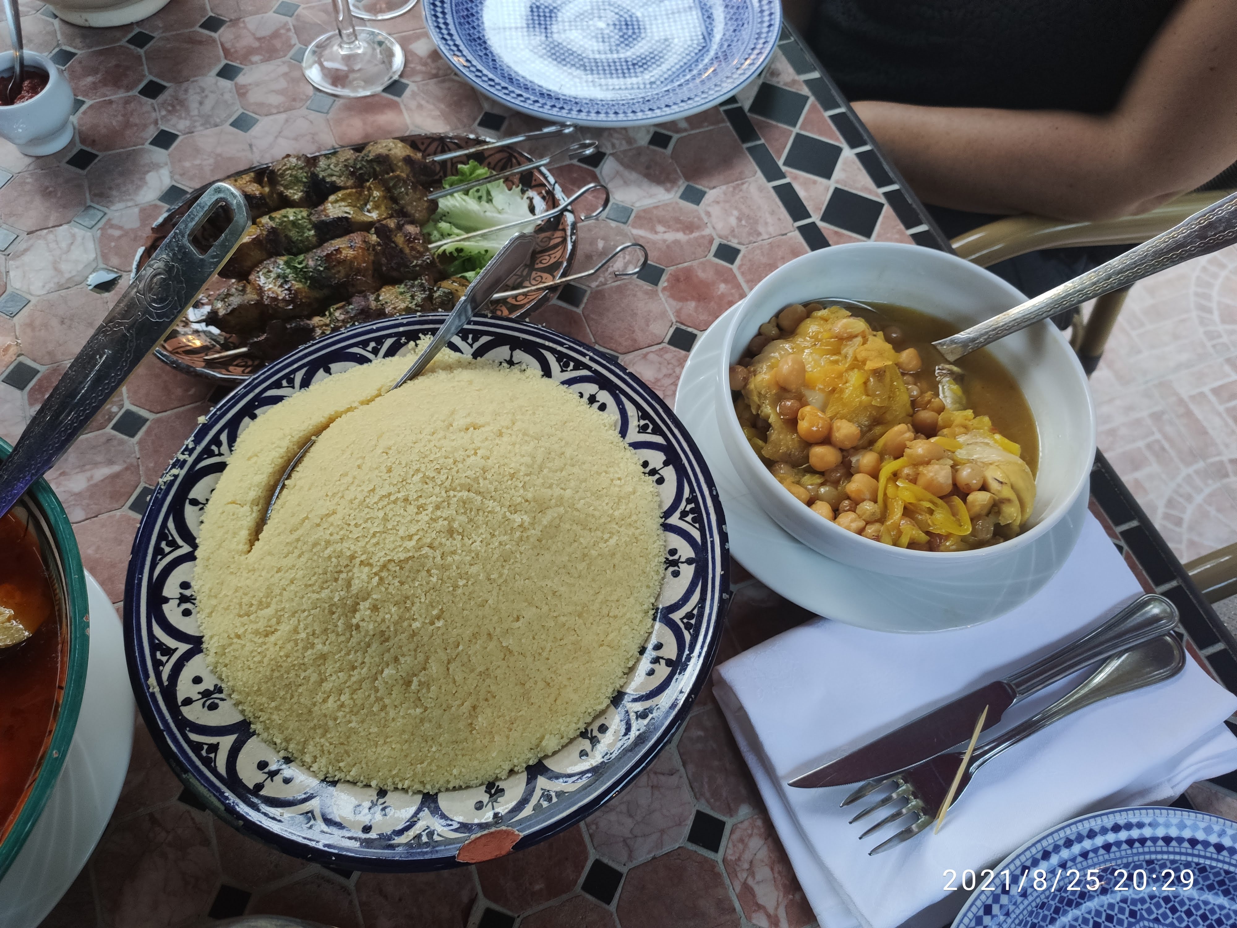 Coucous poulet vraiment petit Tajine très bon Couscous brochette d’agneau très bon aussi Variété de légume PAS ASSEZ DE CHAUFFAGE Il fait si froid c’est dommage…