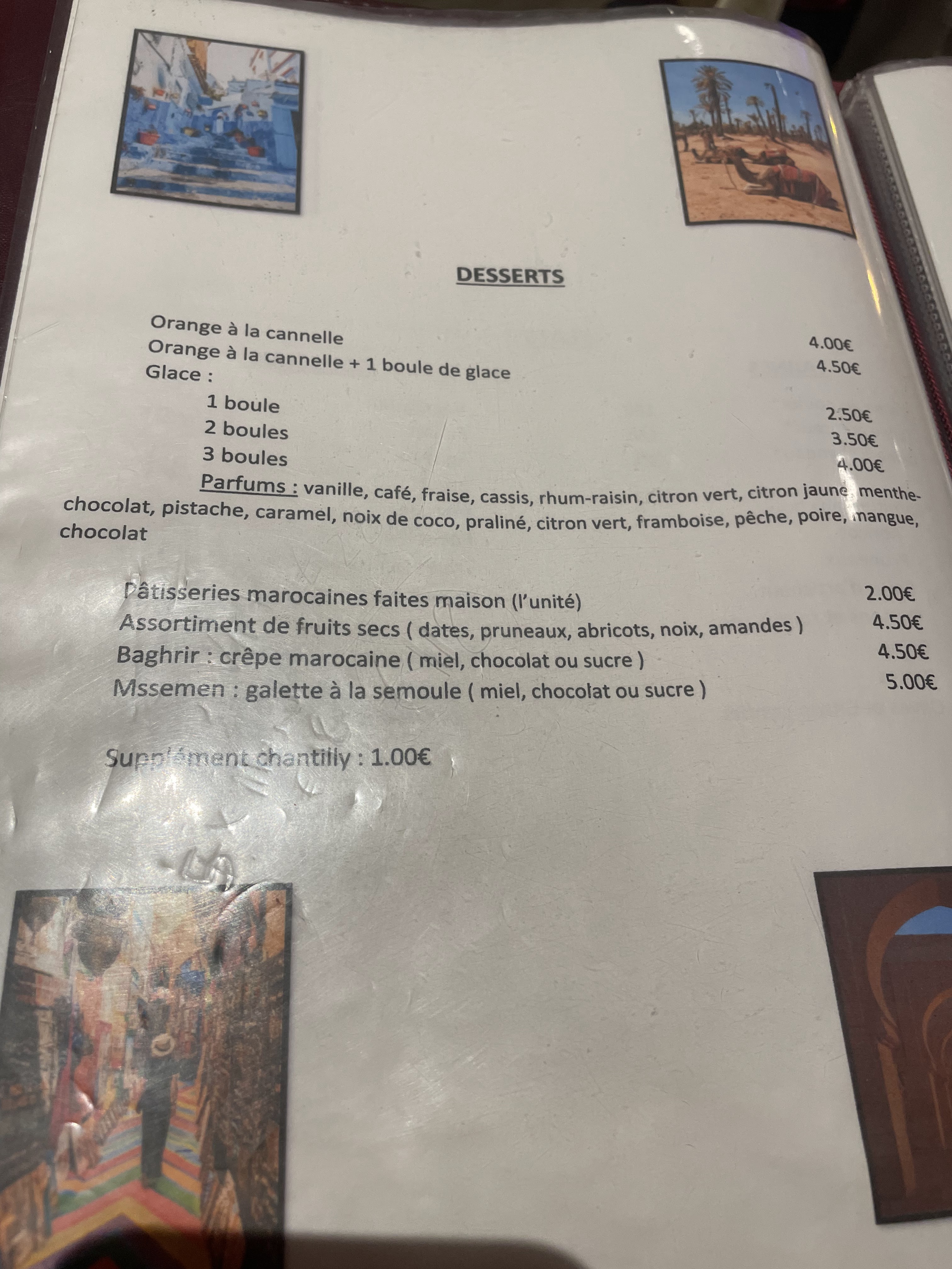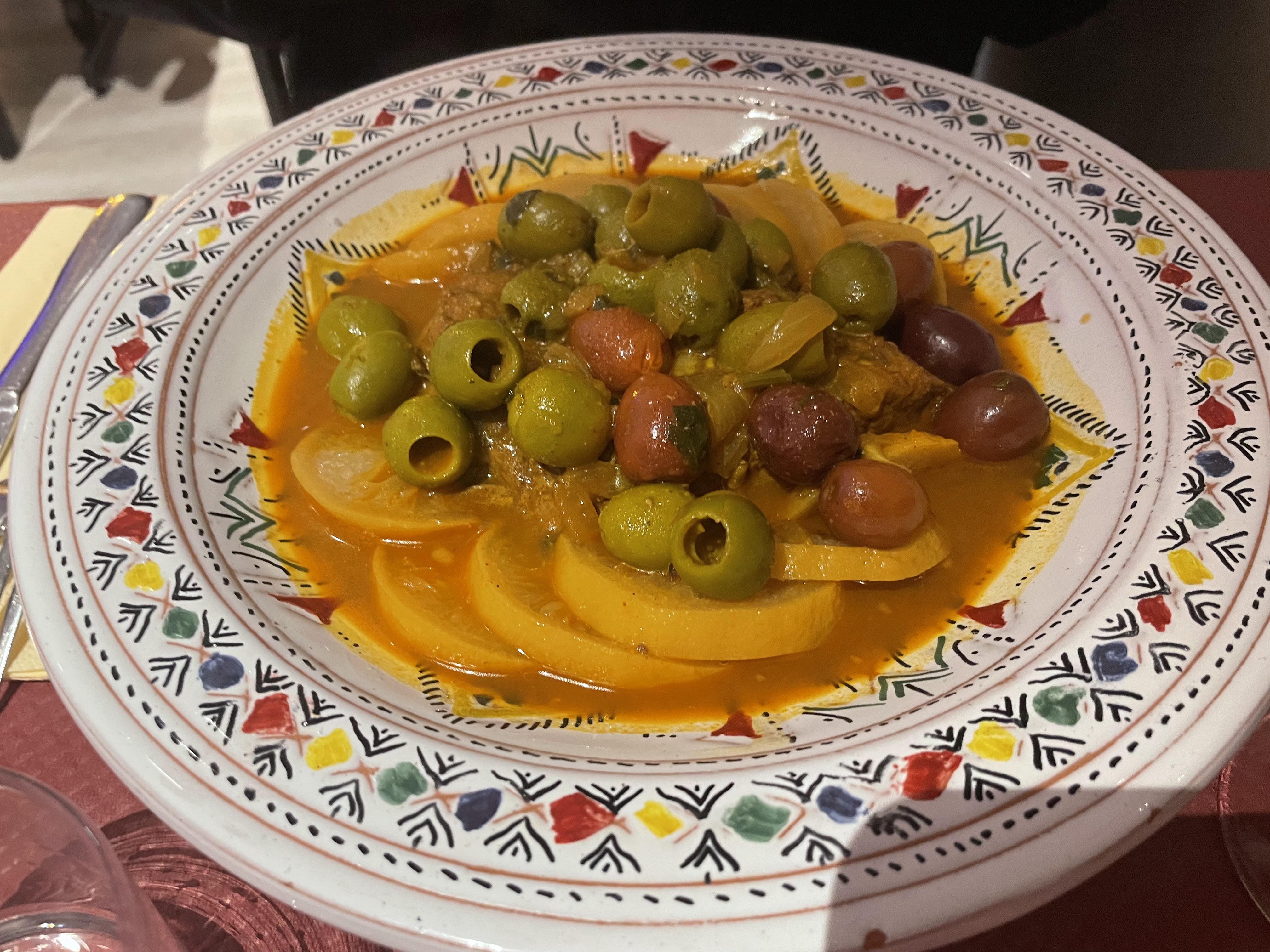Cela fait bien longtemps que je n avais pas manger une cuisine traditionnelle marocaine: la chorba aussi bonne qu'à Marrakech, un tajine délicieux, un couscous très copieux. Seul bémol : les pâtisseries orientales qui ne sont vraiment pas au rendez-vous.