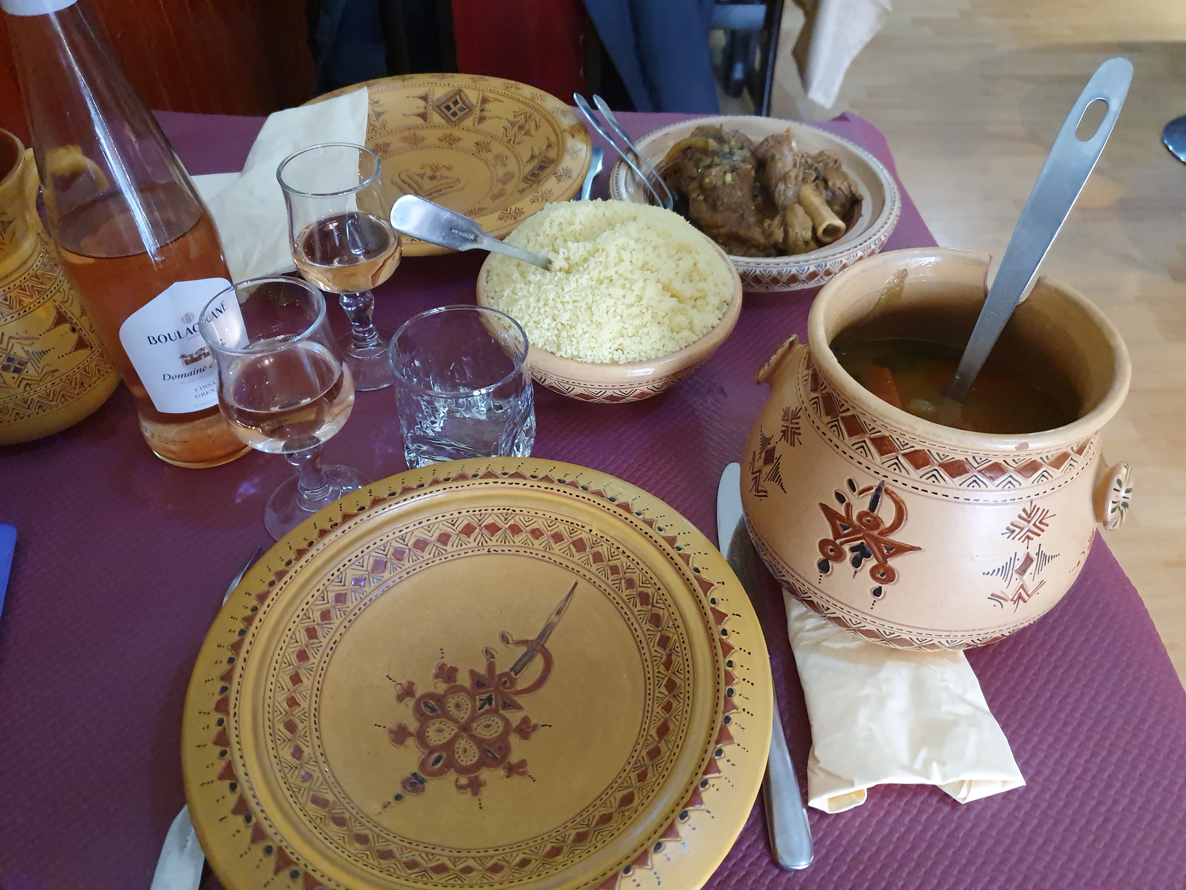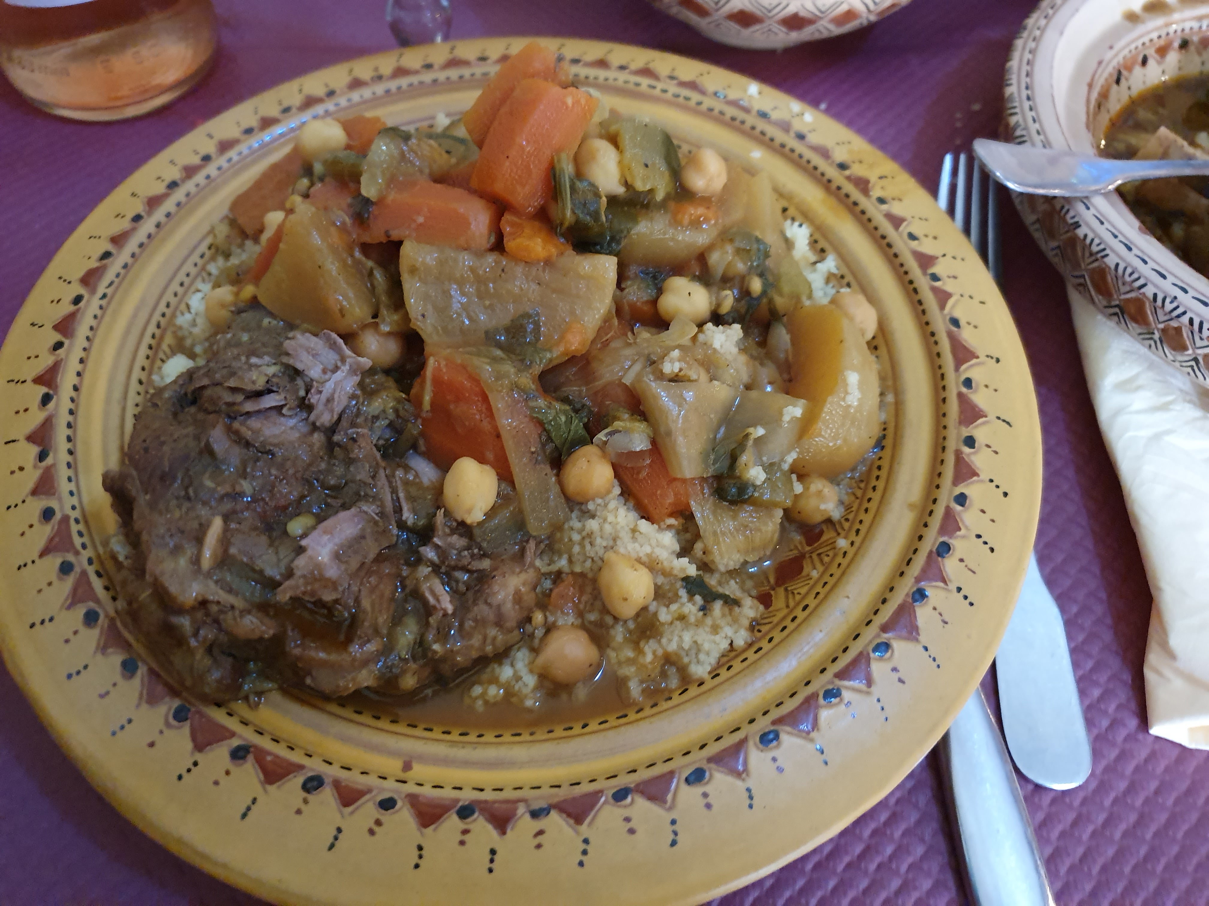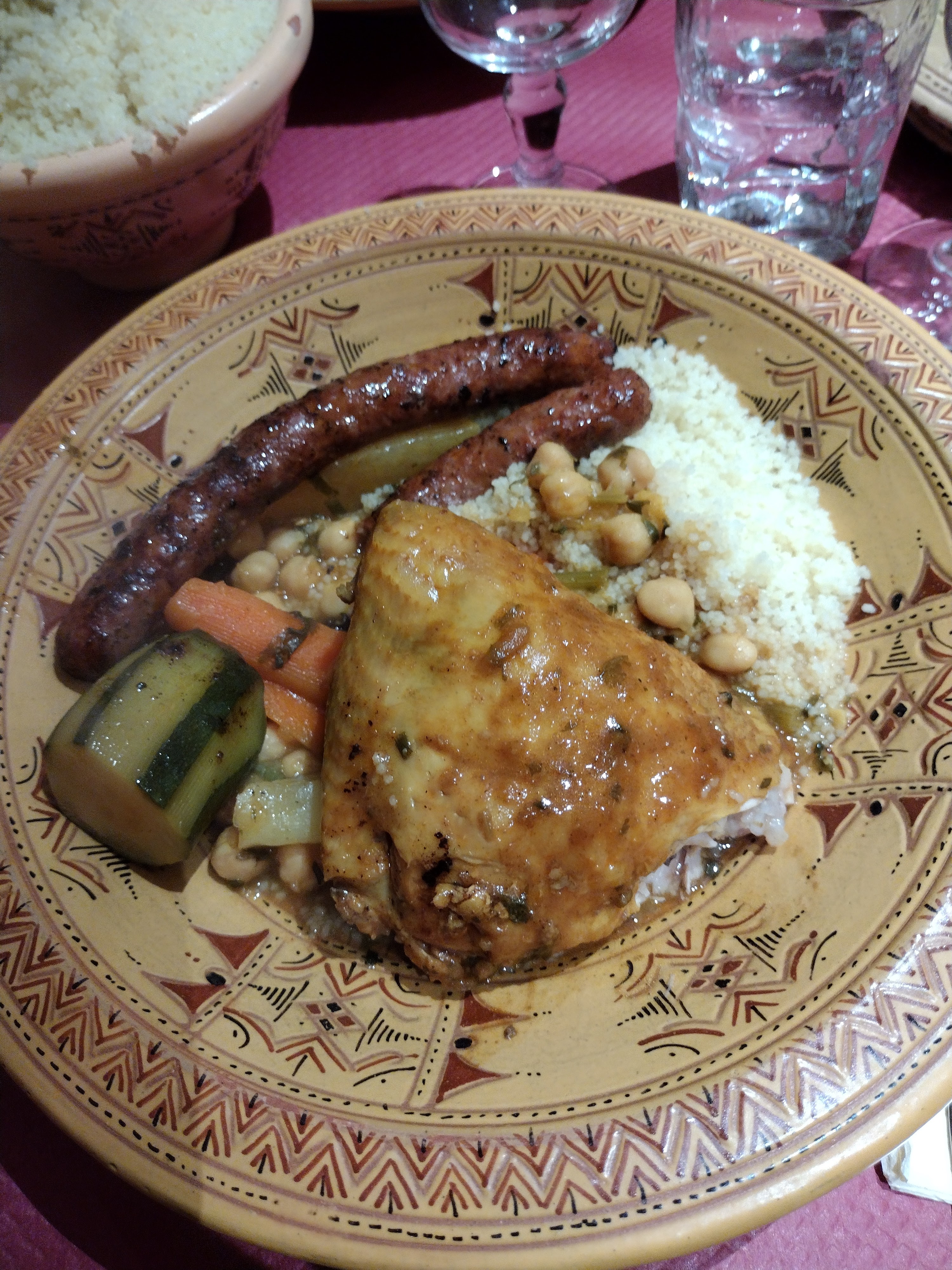 Bon couscous servi dans une très belle vaisselle mais trop d'épices dominantes dans la sauce ( girofle je suppose)