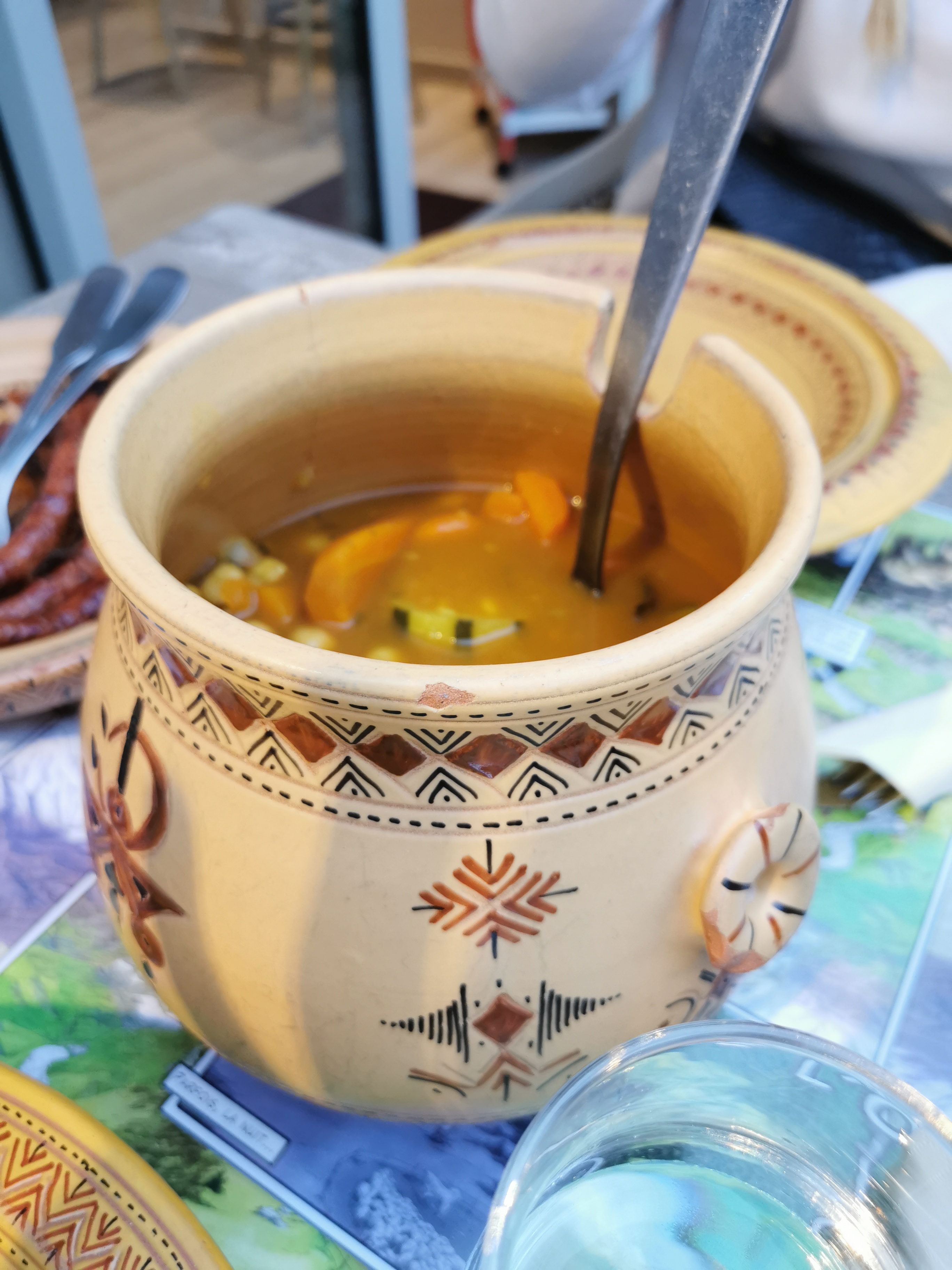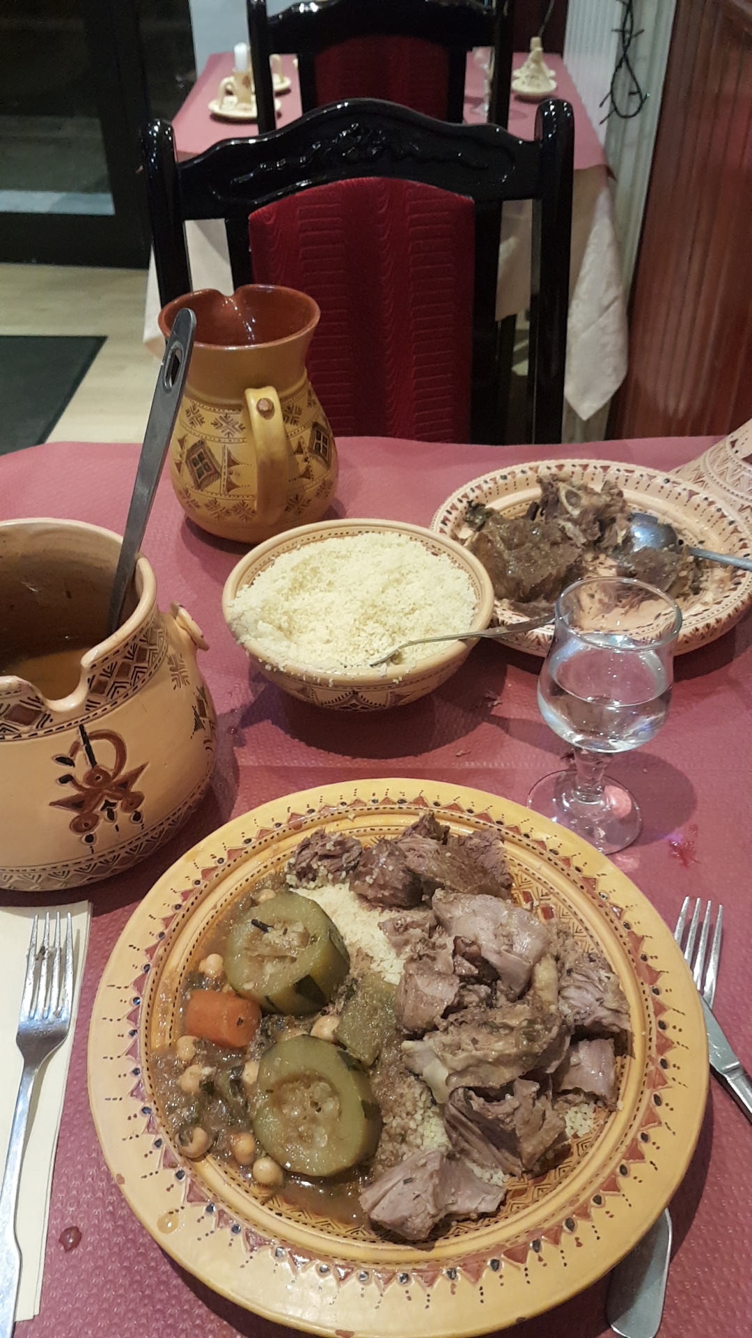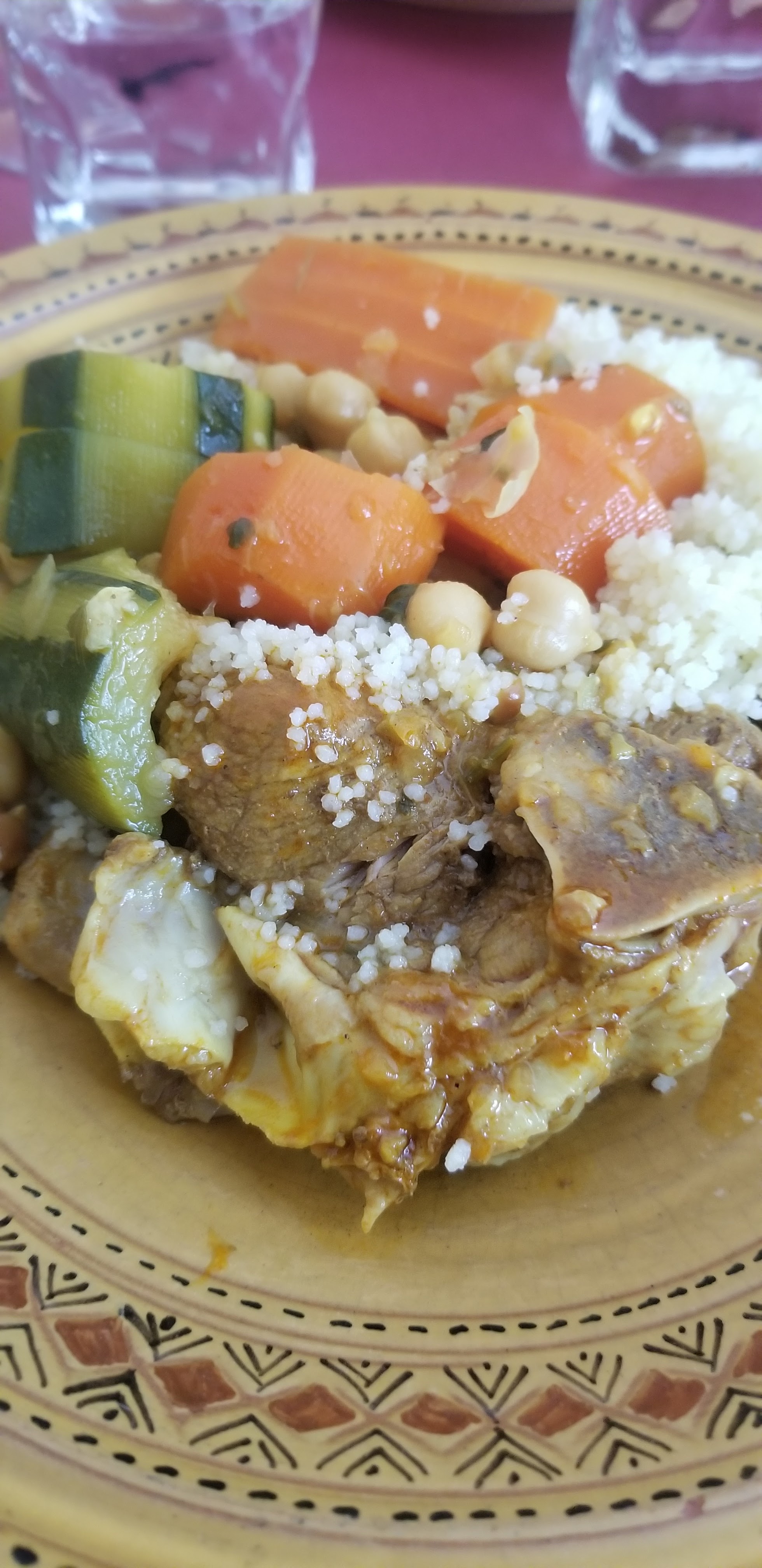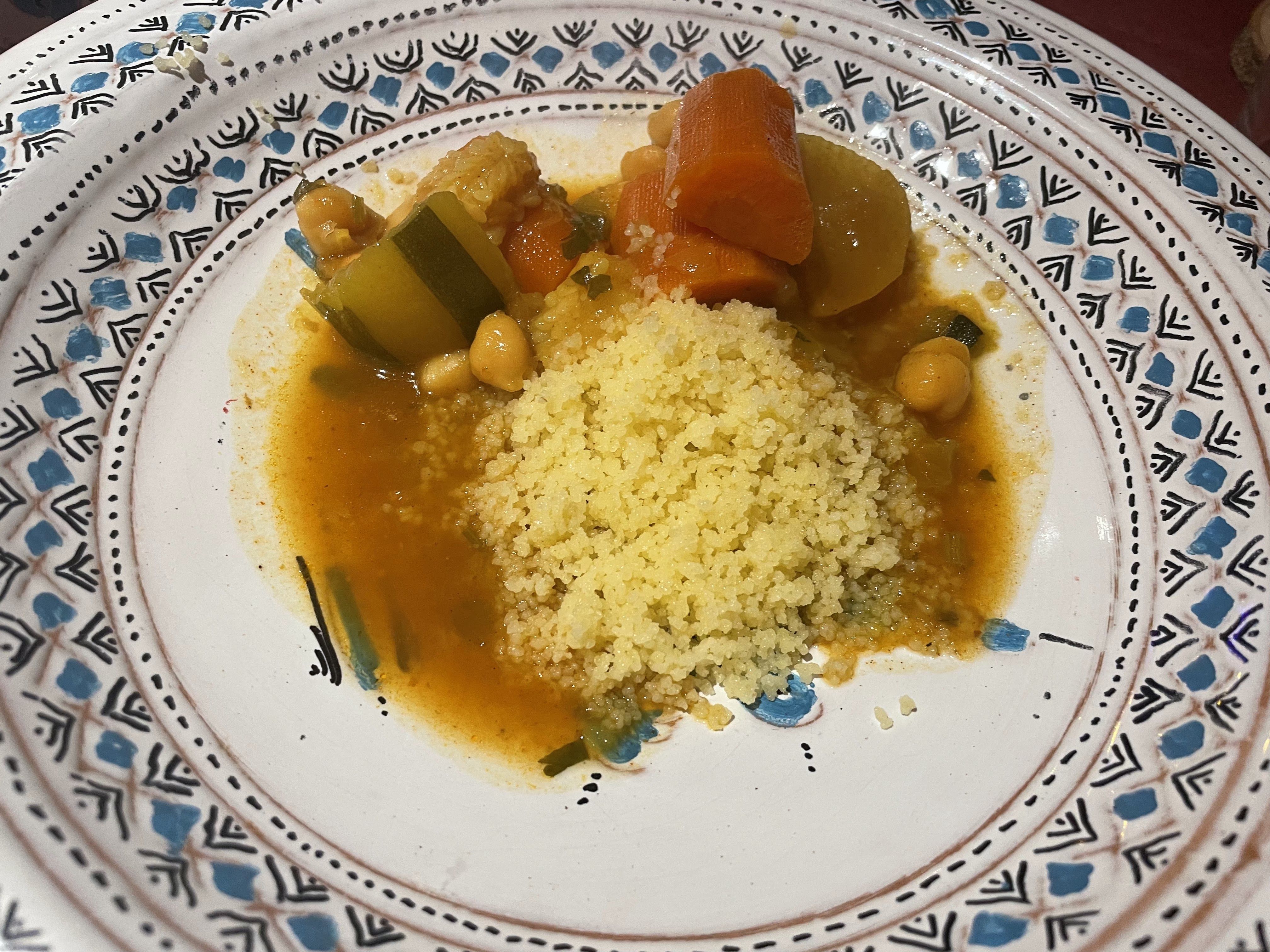 Bon couscous servi dans une très belle vaisselle mais trop d'épices dominantes dans la sauce ( girofle je suppose)
