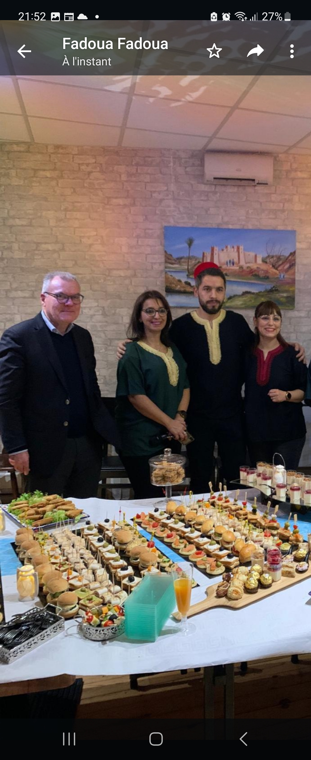 C est un restaurant très chaleureux, la decoration représente bien le Maroc,la cuisine est excellente, un régal. Les filles sont d une gentillesse et toujours présent si on à besoin et petit digestif offert. Je le recommande à 100% pour 100%, n hésitez pas ,vous allez vous régalé. Merci encore