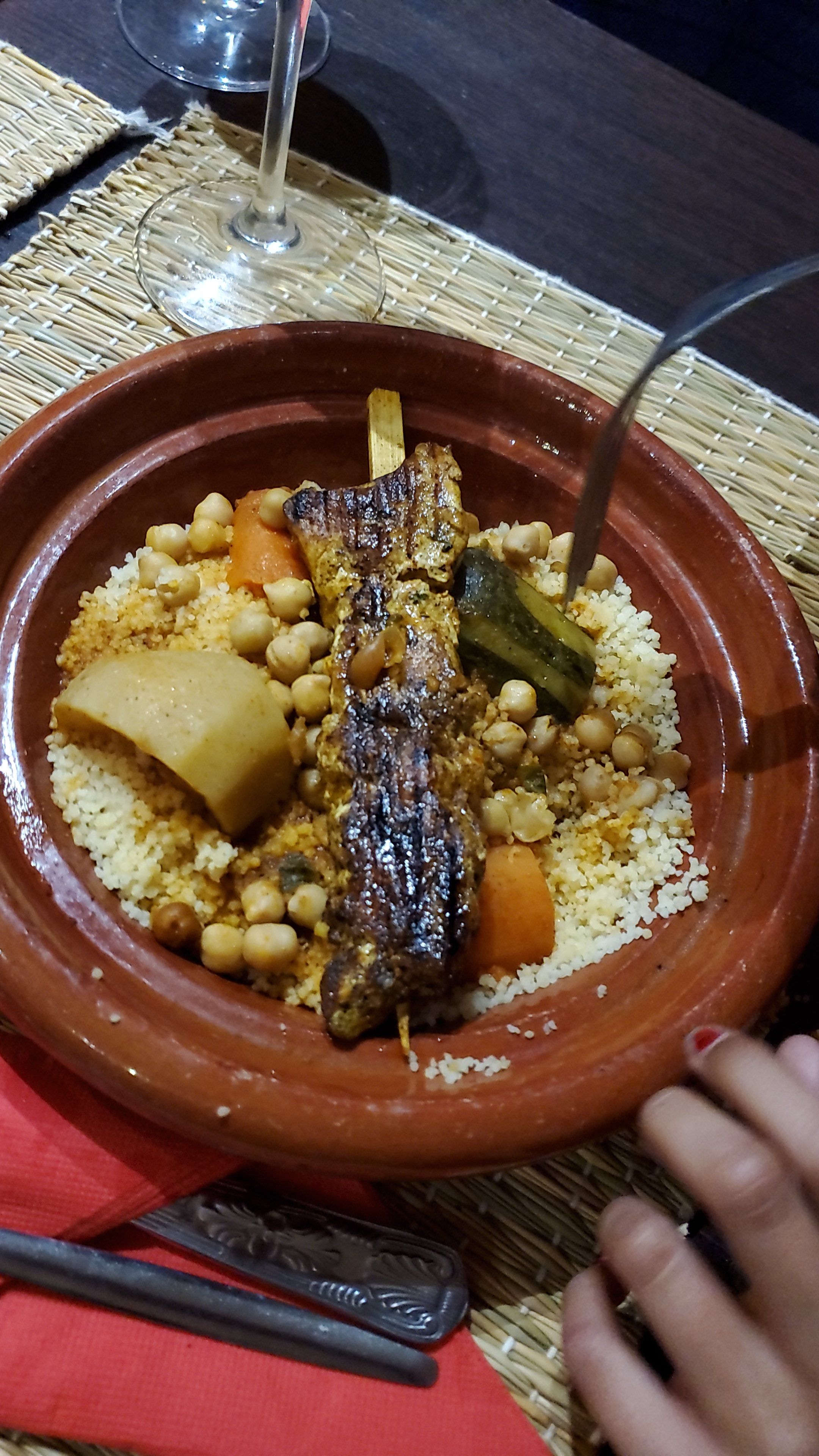 Très gentils .Pas très professionnels.Couscous servi individuellement dans des plats à tajines, froid, pas de pois chiches,quant à la tajine....