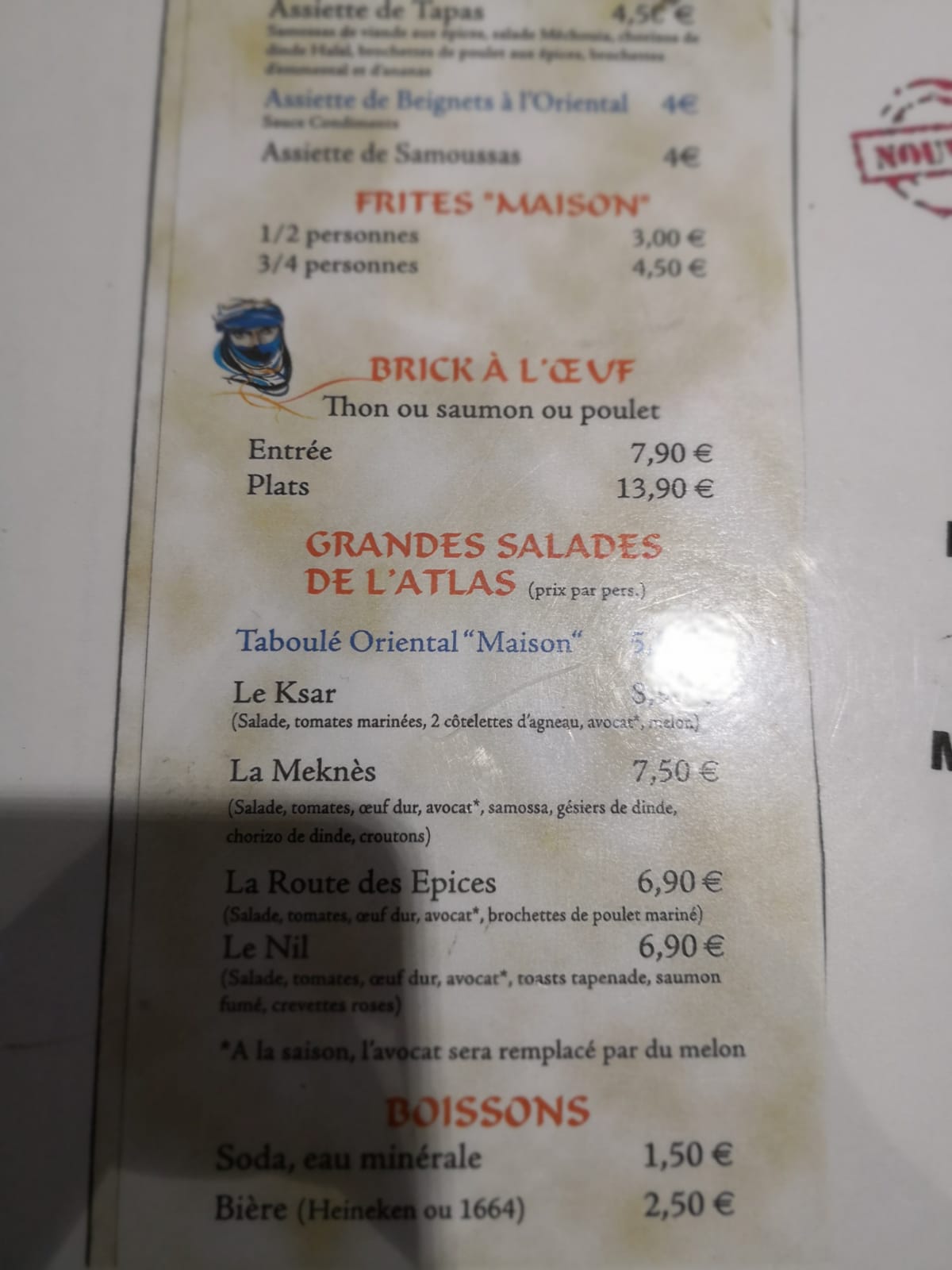 Je suis venue ce week end.Pâtisseries copieuses.Brick à l’œuf,que j’ai commandé à l’avance,parfait! On était dans une petite salle conviviale à gauche avec un style orientale. Le patron nous avait prévenue qu’il y avait un petit courant d’air. Serveuses avenantes et gracieuses,à refaire c’était parfait. Merci encore pour votre accueil.