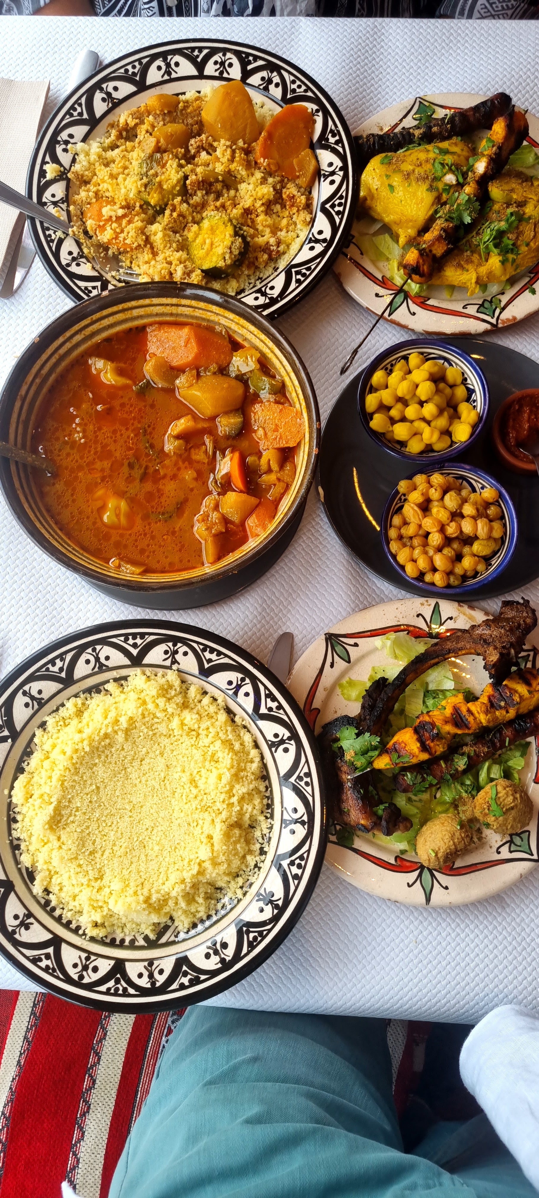 L'accueil est très bien, le cadre aussi, le couscous est très bon, rien à dire au niveau de la qualité et du goût. En revanche, il n'y a pas de mise en bouche (émincés de carottes olives à la marocaine dans de petits récipients) pour faire patienter avec les premières gorgées de vin. La semoule, très bonne, est donnée un peu au compte goutte, tout comme les légumes dans le bouillon, qui reste cependant excellent ! Il ne faut donc pas grand chose pour nettement améliorer non pas la qualité qui est excellente mais le confort de la dégustation.