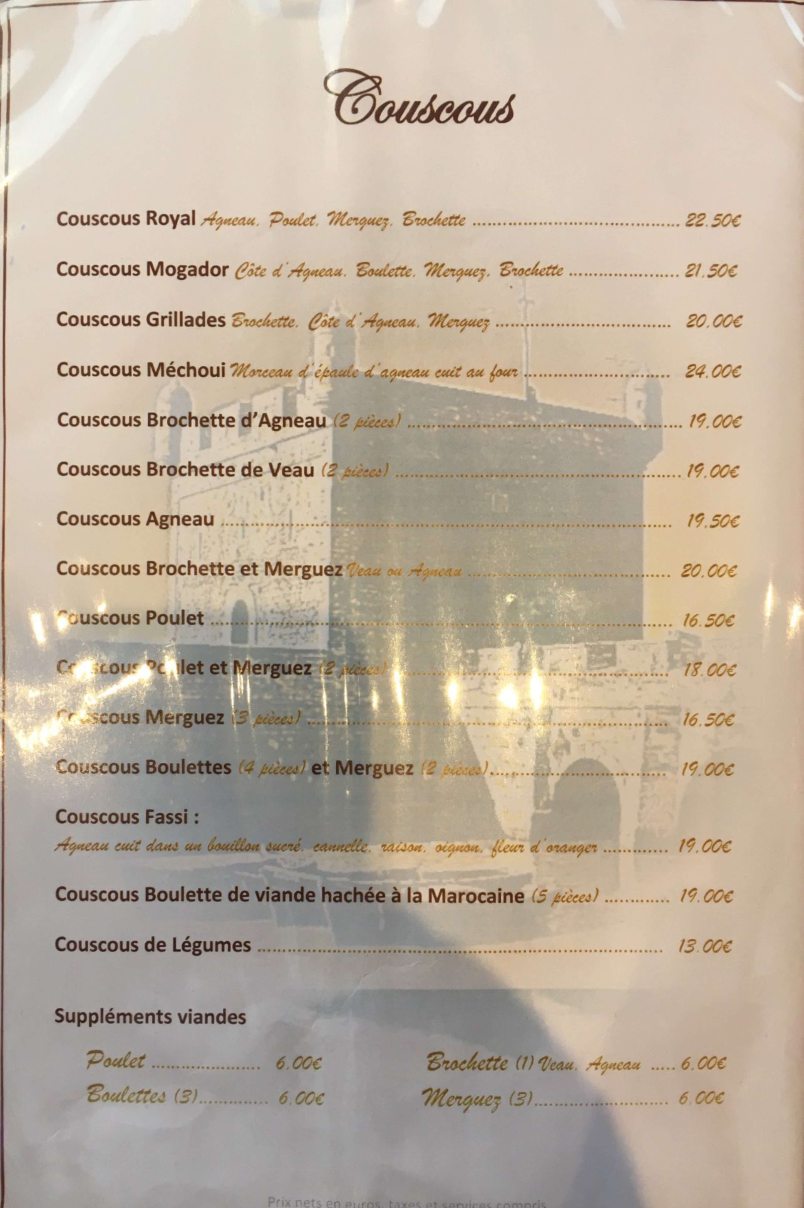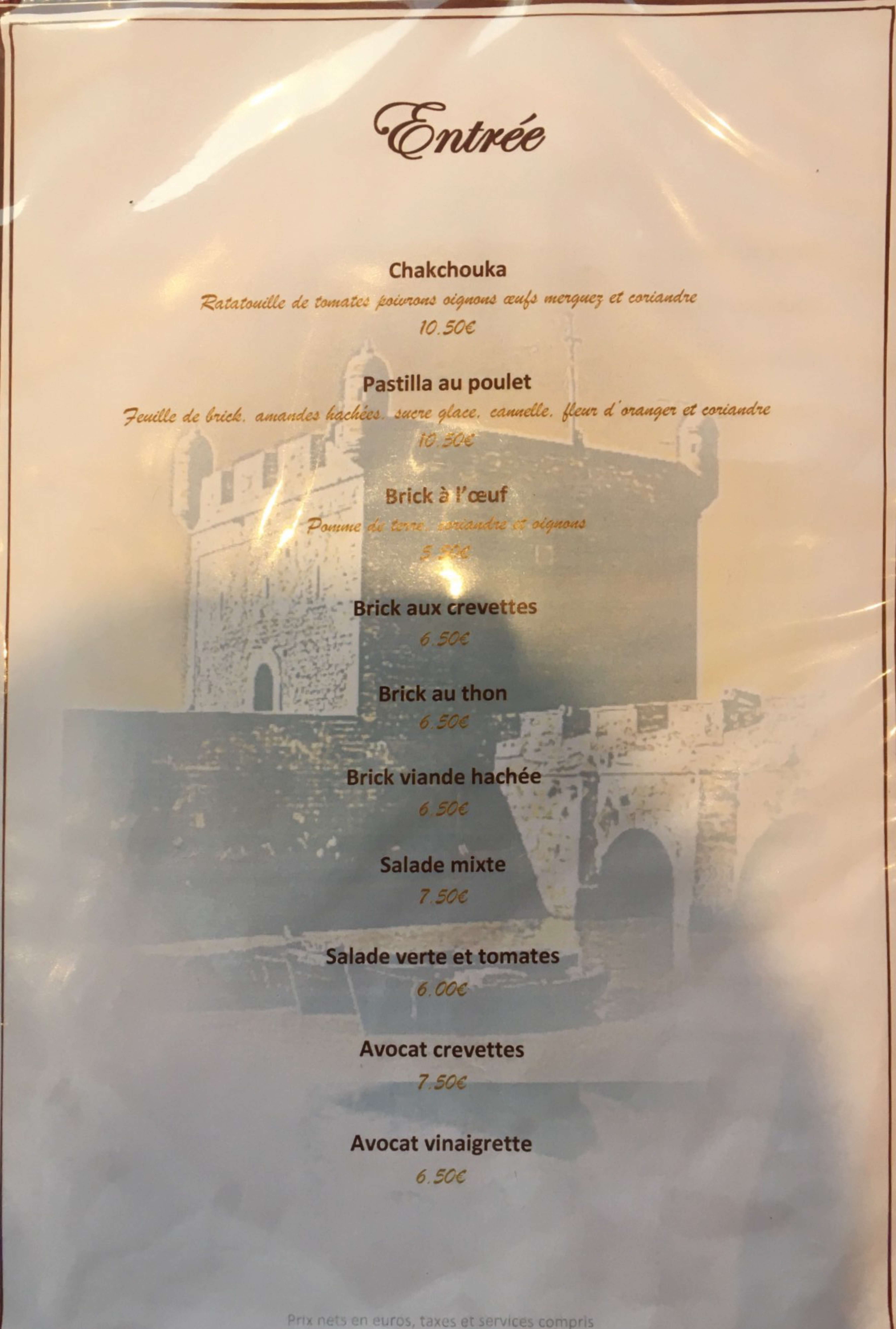 Je déconseille semoule pas très bonne , viande pas cuite jai redemander de la cuire mais la viande est arrivé brûler , brick a la crevette vraiment pas bonne car l'oeuf étais cru et les crevette cru aussi , nous on dépêcher a finir car il étais 22h15 vraiment restaurant a évité mauvaise digestion .