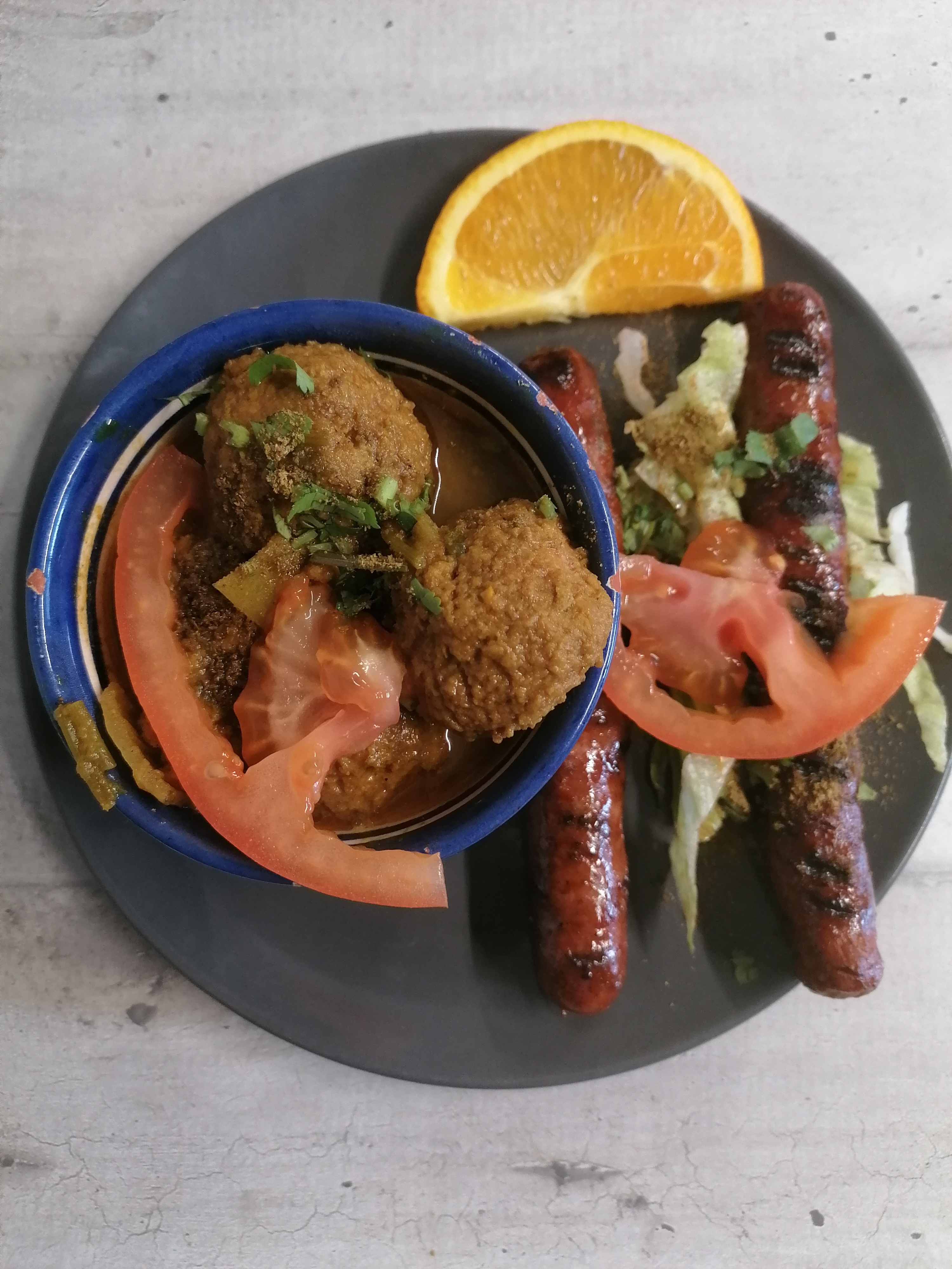 C'est une première découverte pour nous qui avions l'habitude de manger au restaurant des Deux Palmiers. Accueil très chaleureux, très bon service, copieux. Le cadre est très sympathique. Le couscous très bien mais le bouillon avec les légumes manquent un peu de goût 😞. La semoule très bonne, la viande d'agneau excellente. Les boulettes a revoir bof sans plus... Merguez et brochettes très bien 👍. Le dessert orange Marocaine ben vraiment pas goûteux, manque de saveur dommage.... Le vin de rosé Guerrouane est excellent 👏❤️👍 s'accompagne très bien avec le couscous. Pas vraiment déçu du restaurant mais quelques corrections à faire. Bouillon avec légumes et boulettes.