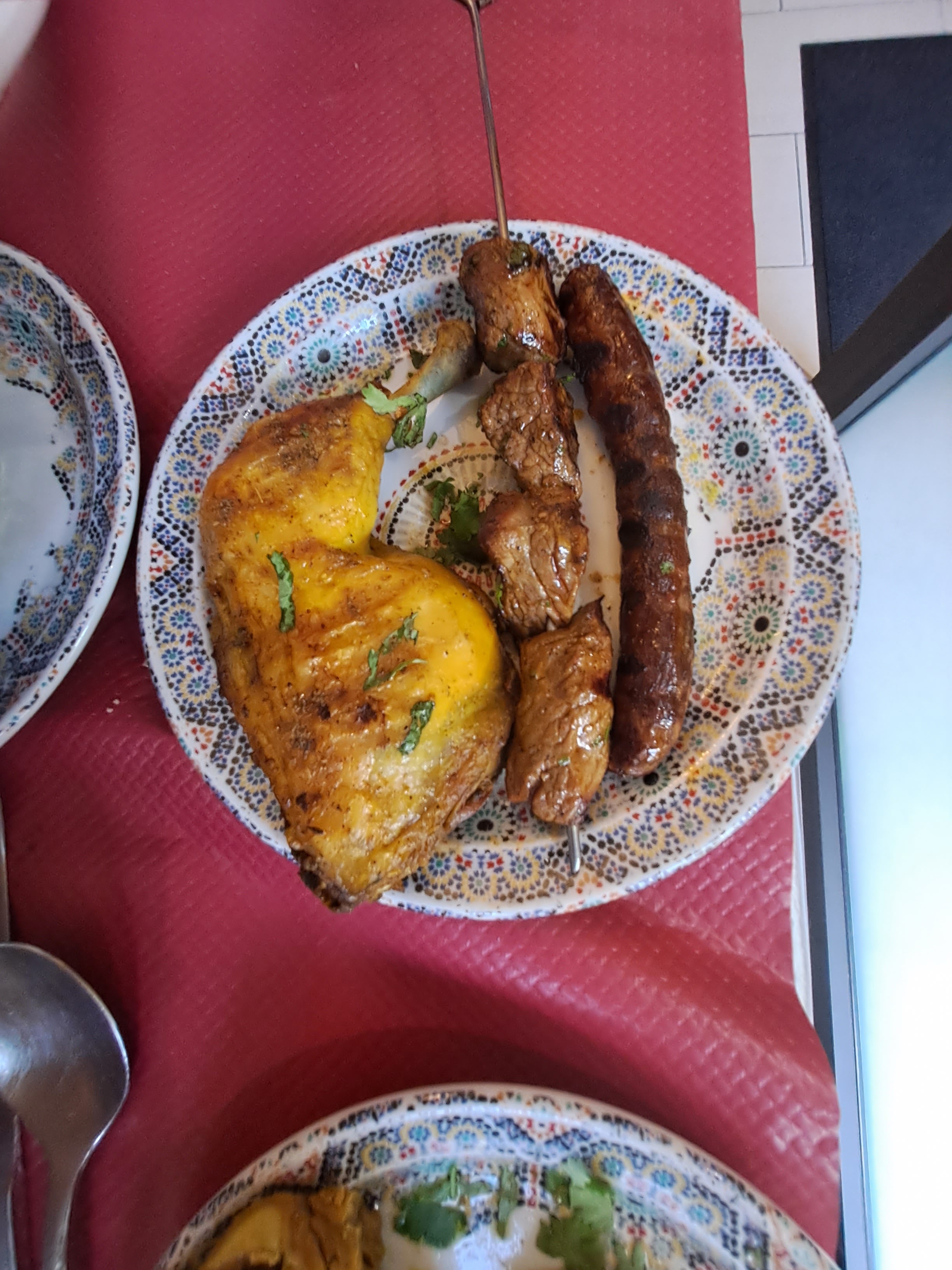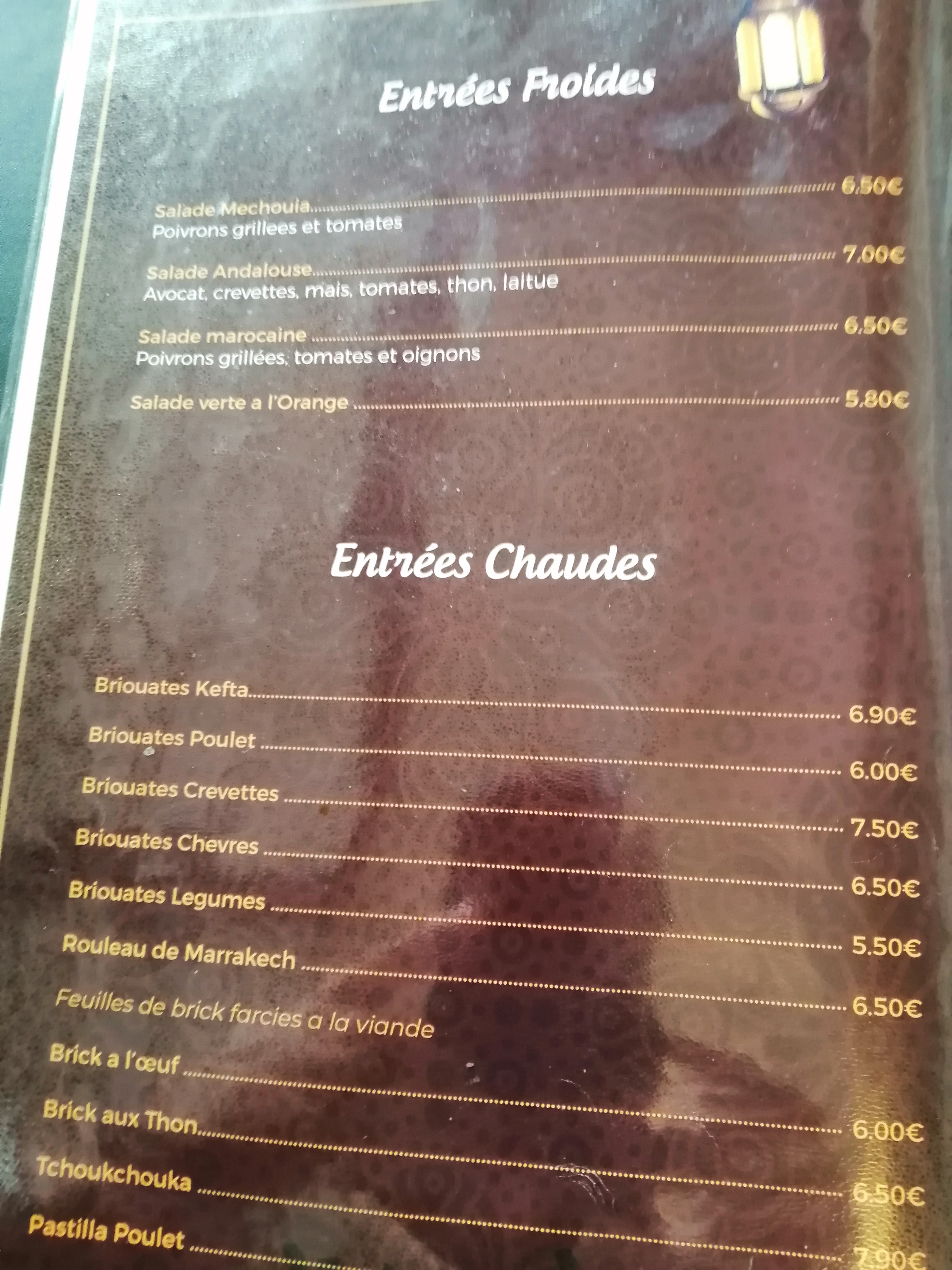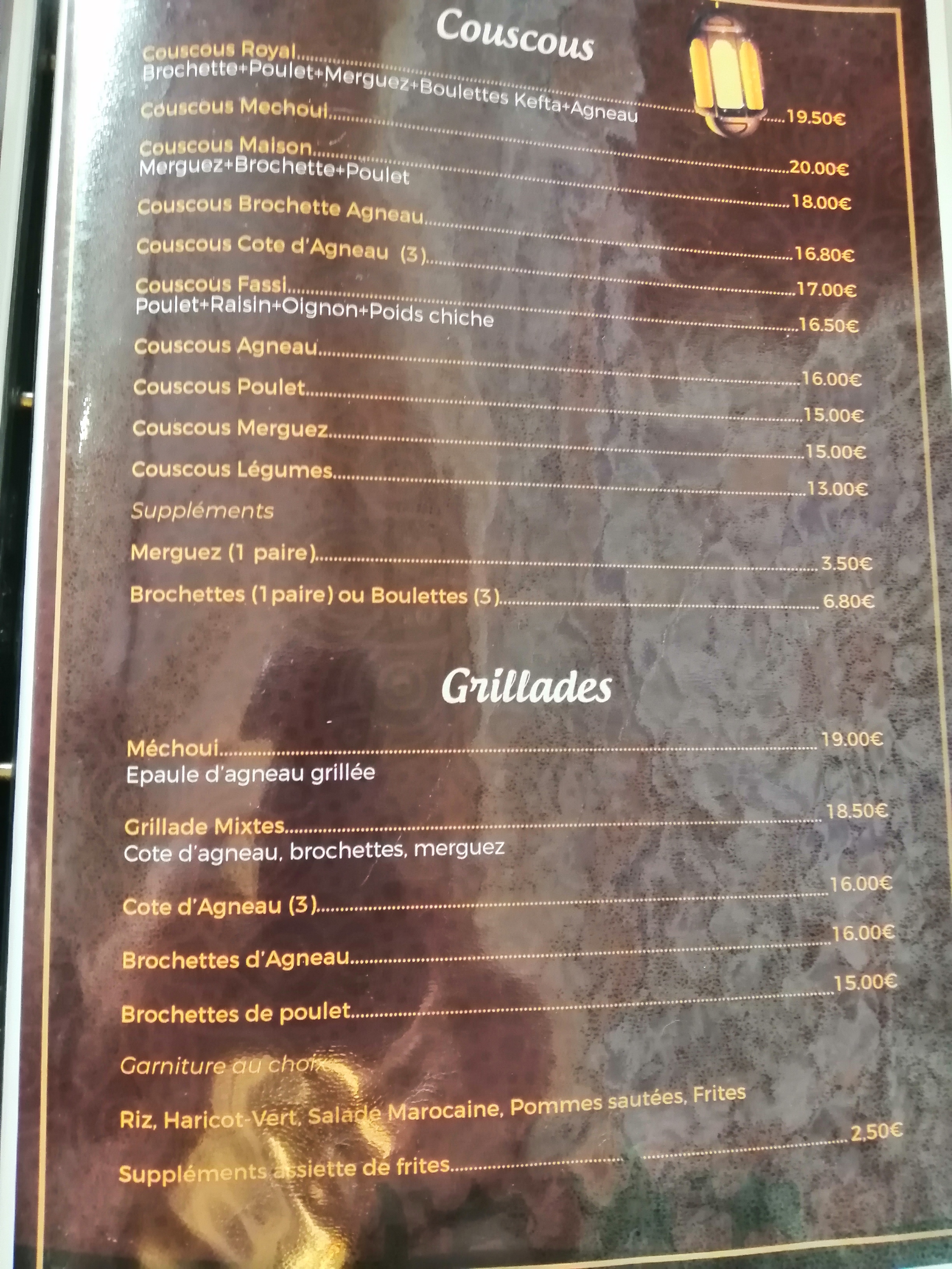 un très bon repas pris entre amis, les entrées sont copieuses tout comme les tajines ou les couscous. petit plus sur la qualité de la viande, le méchoui est juste succulent, la viande semble confite, la peau est croustillante et la viande juteuse... une petite merveille bravo.