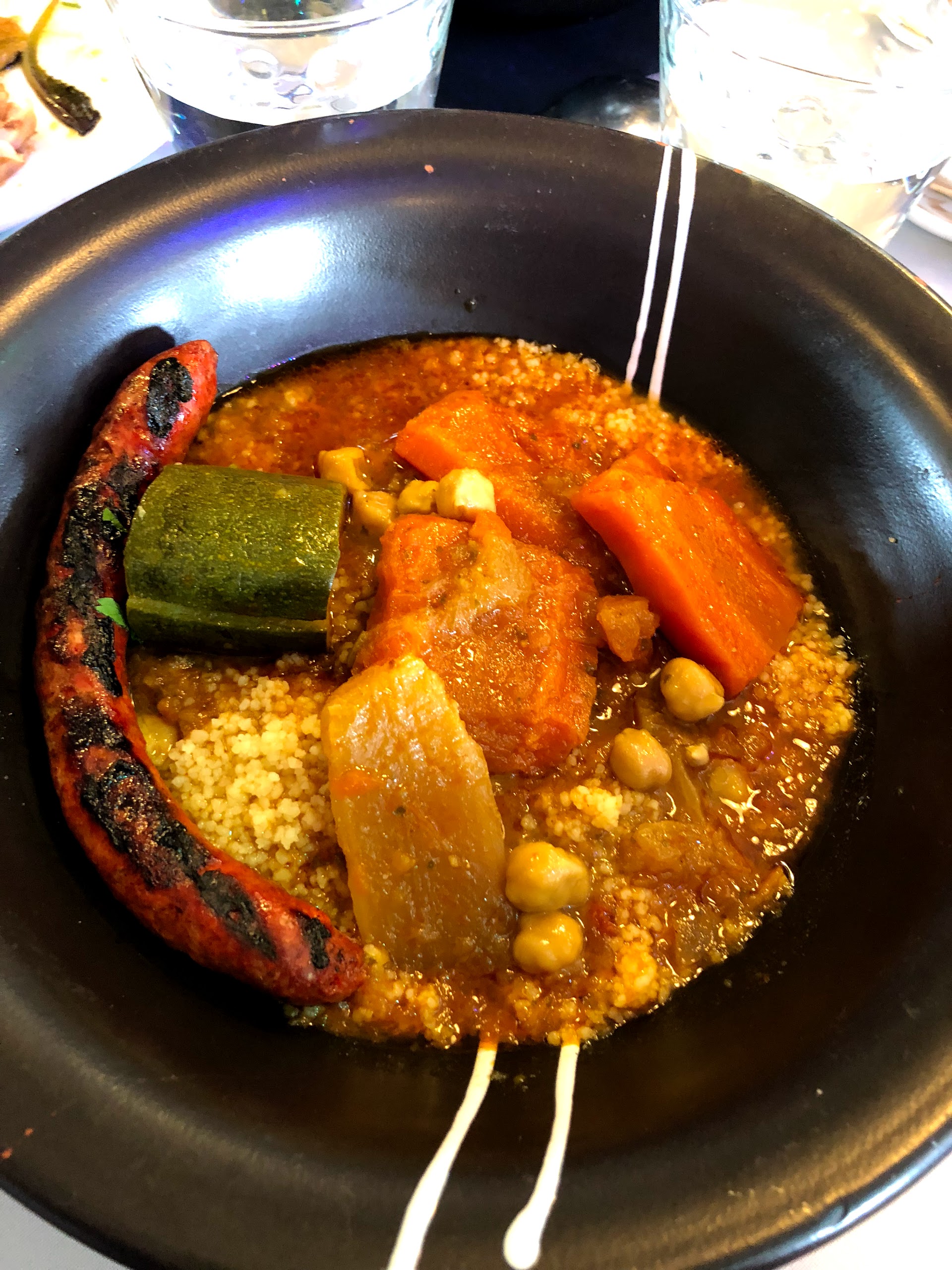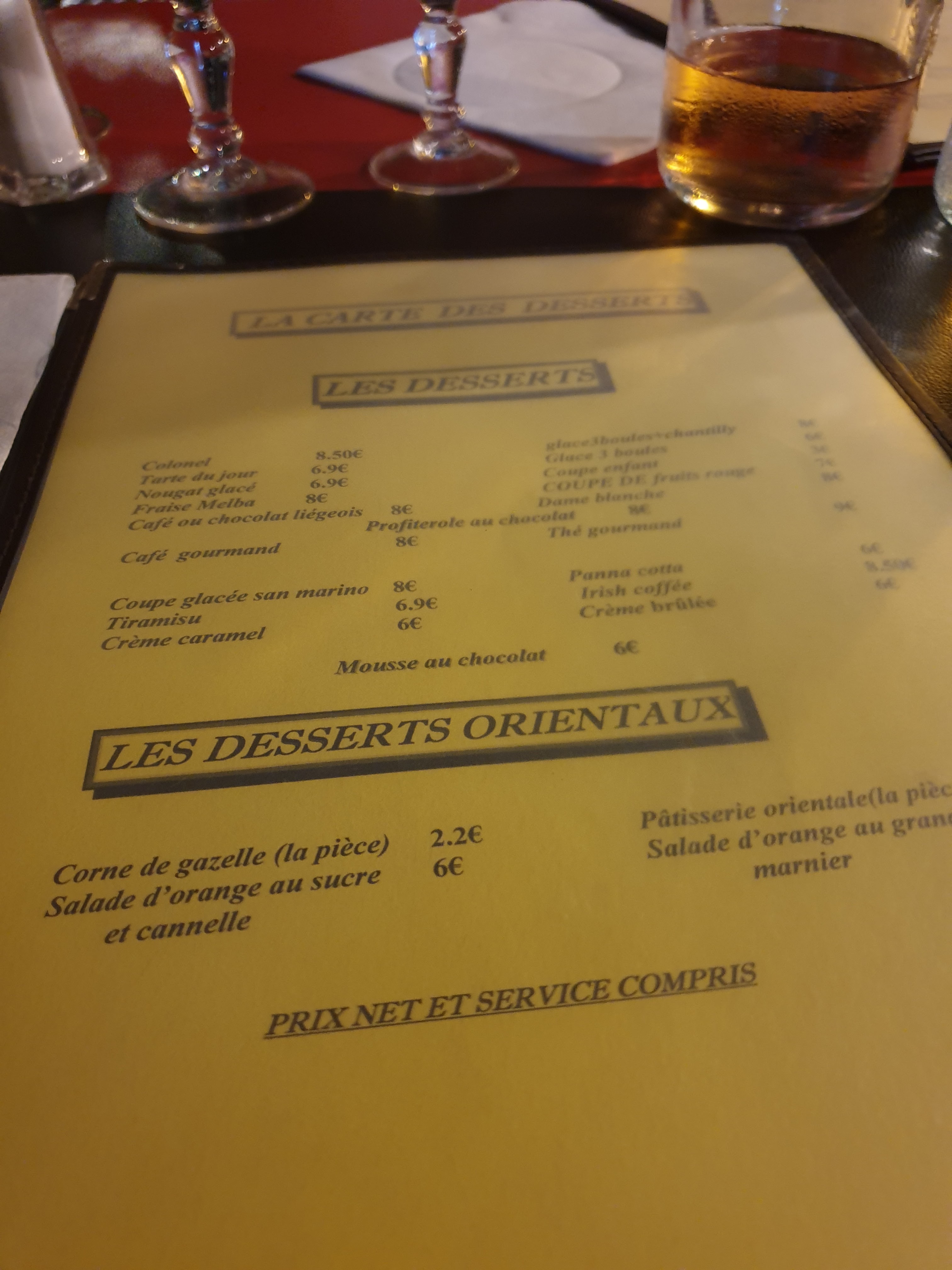 Nous étions en famille Couscous pas terrible Moules sèches et sans goût Loup ça va mais rien d'exceptionnel Le seul plat apprécié c'est le tajine. Tiramisu correct mais très peu en quantité , mieux ailleurs C'est pas trop cher mais vraiment le service est moyen
