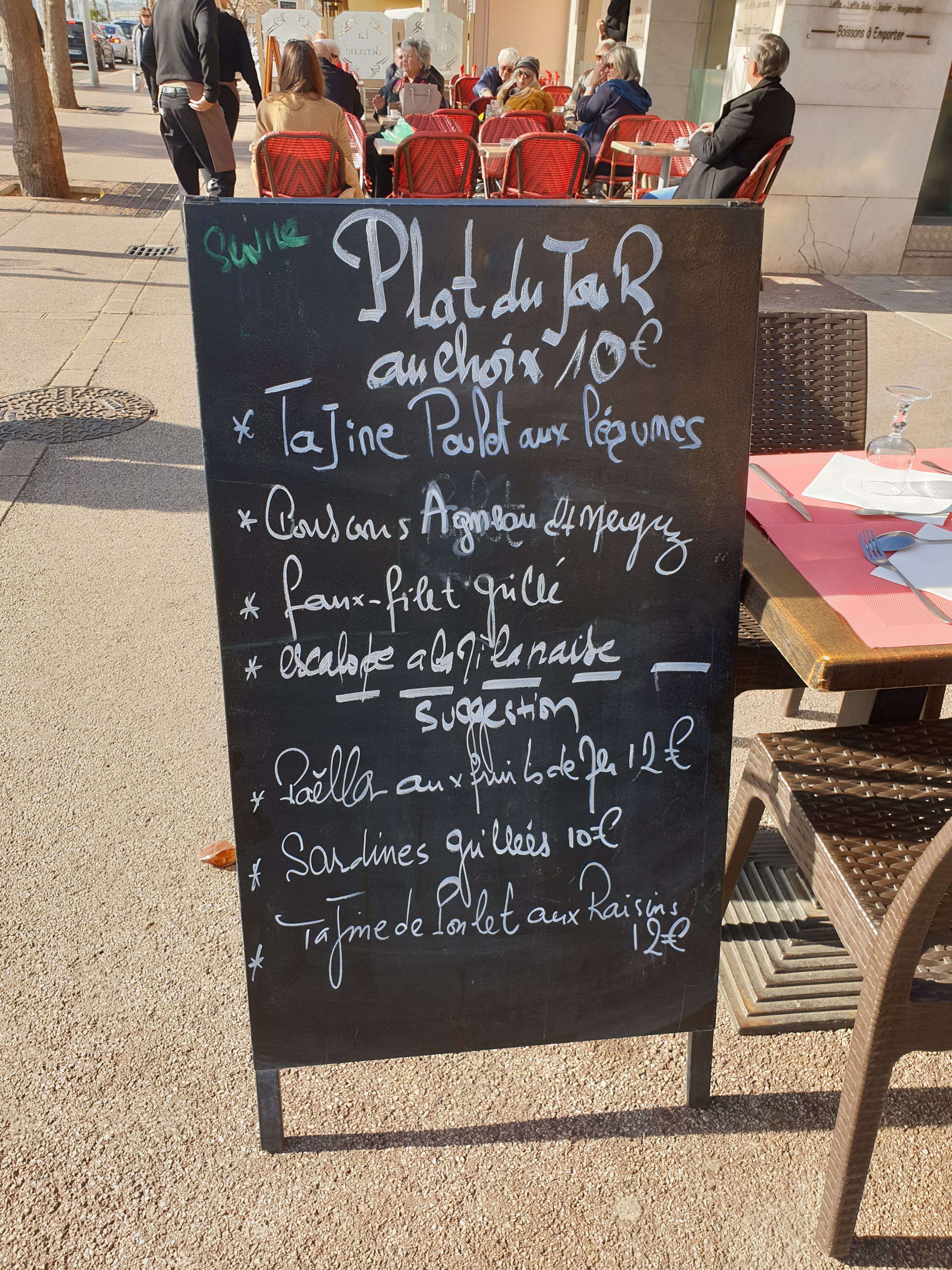 Comme son nom ne l’indique pas, c’est un restaurant Marocain sur la Promenade de la Plage à Cagnes-sur-Mer. Pour déjeuner nous avons naturellement opté pour le tajine de poisson proposé en « plat du jour » ce jour-là. Il était servi fumant et savoureux, accompagné de semoule. Très bon choix d’ailleurs. Malheureusement le serveur ne semble pas être au courant qu’une formule « plat du jour + dessert » à peine plus chère est affiché dans la vitrine et nous a privé de dessert. Donc je le prive d’une étoile.