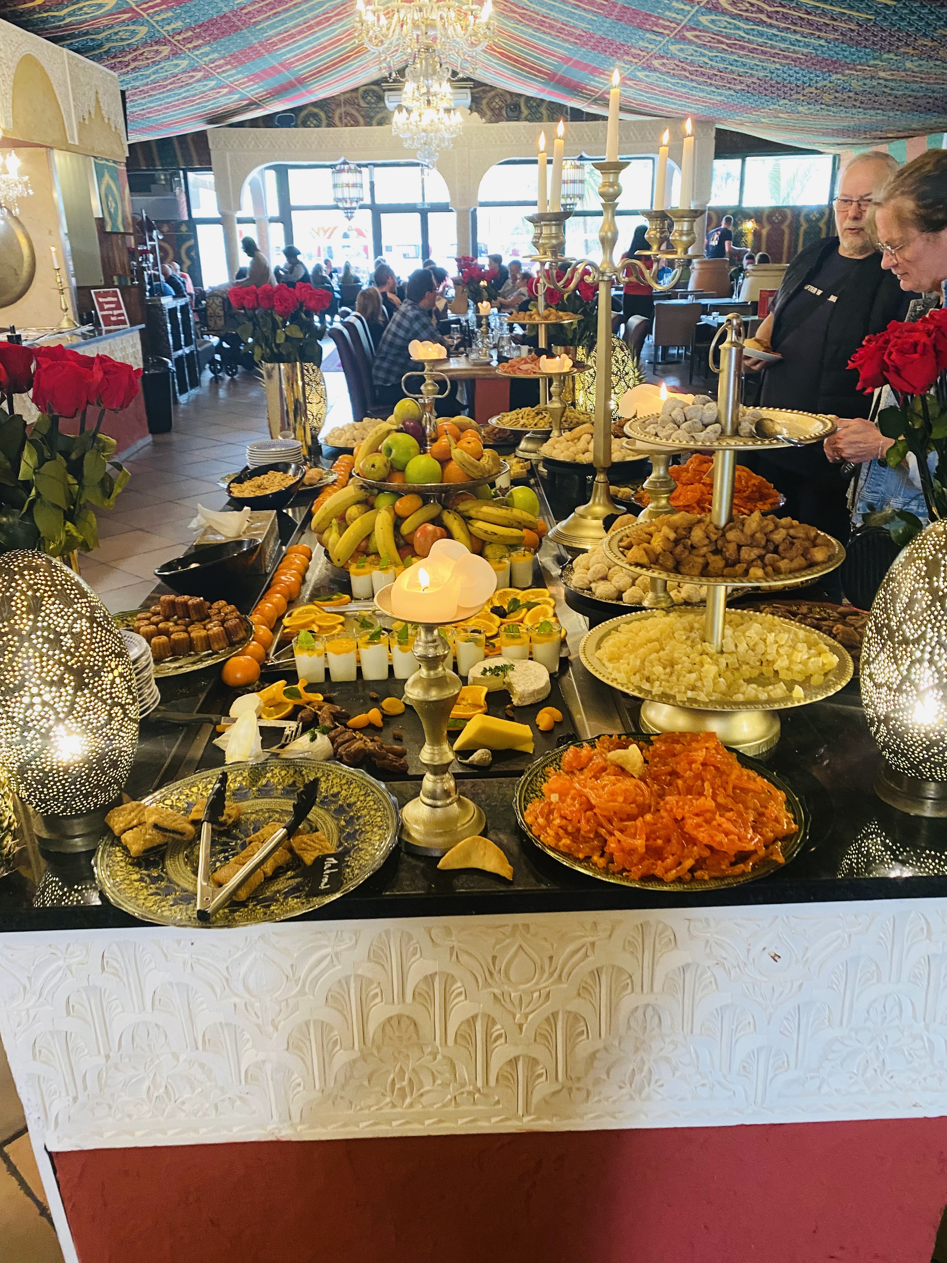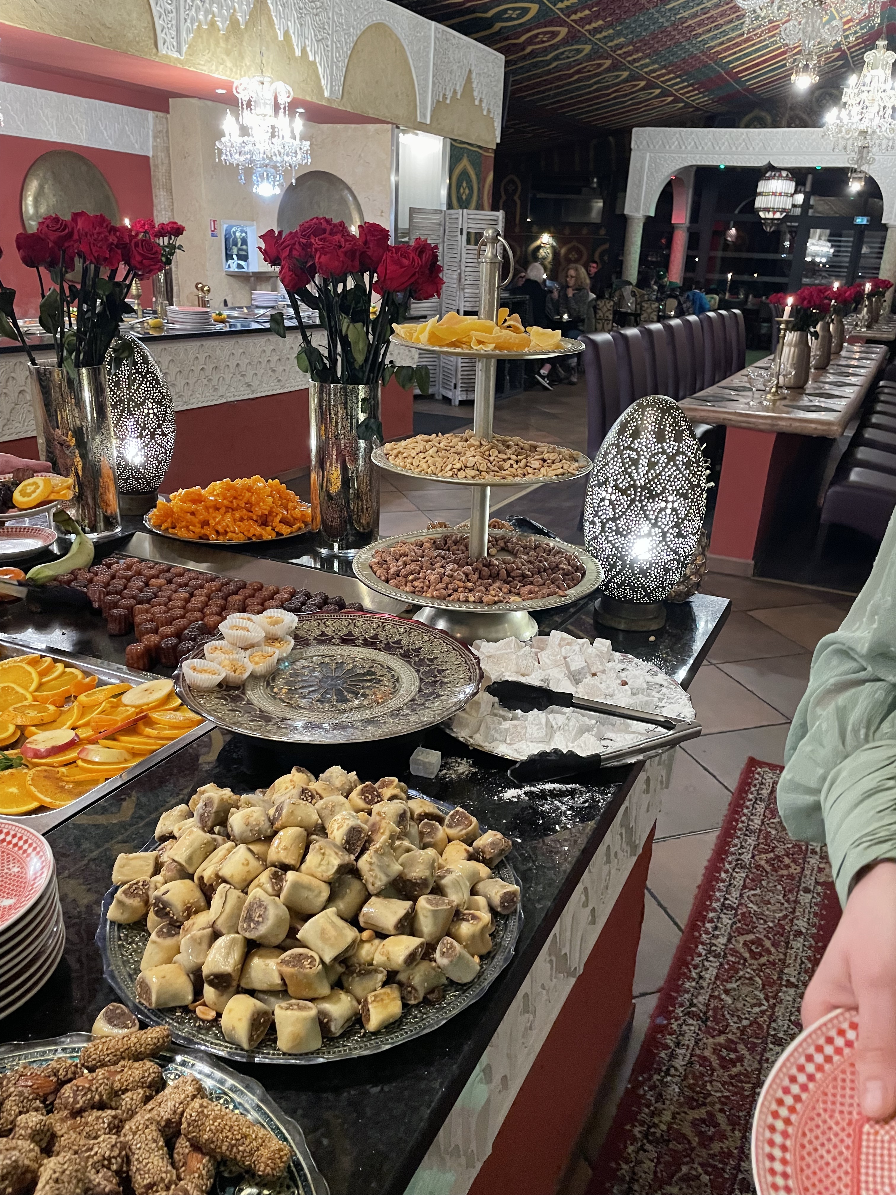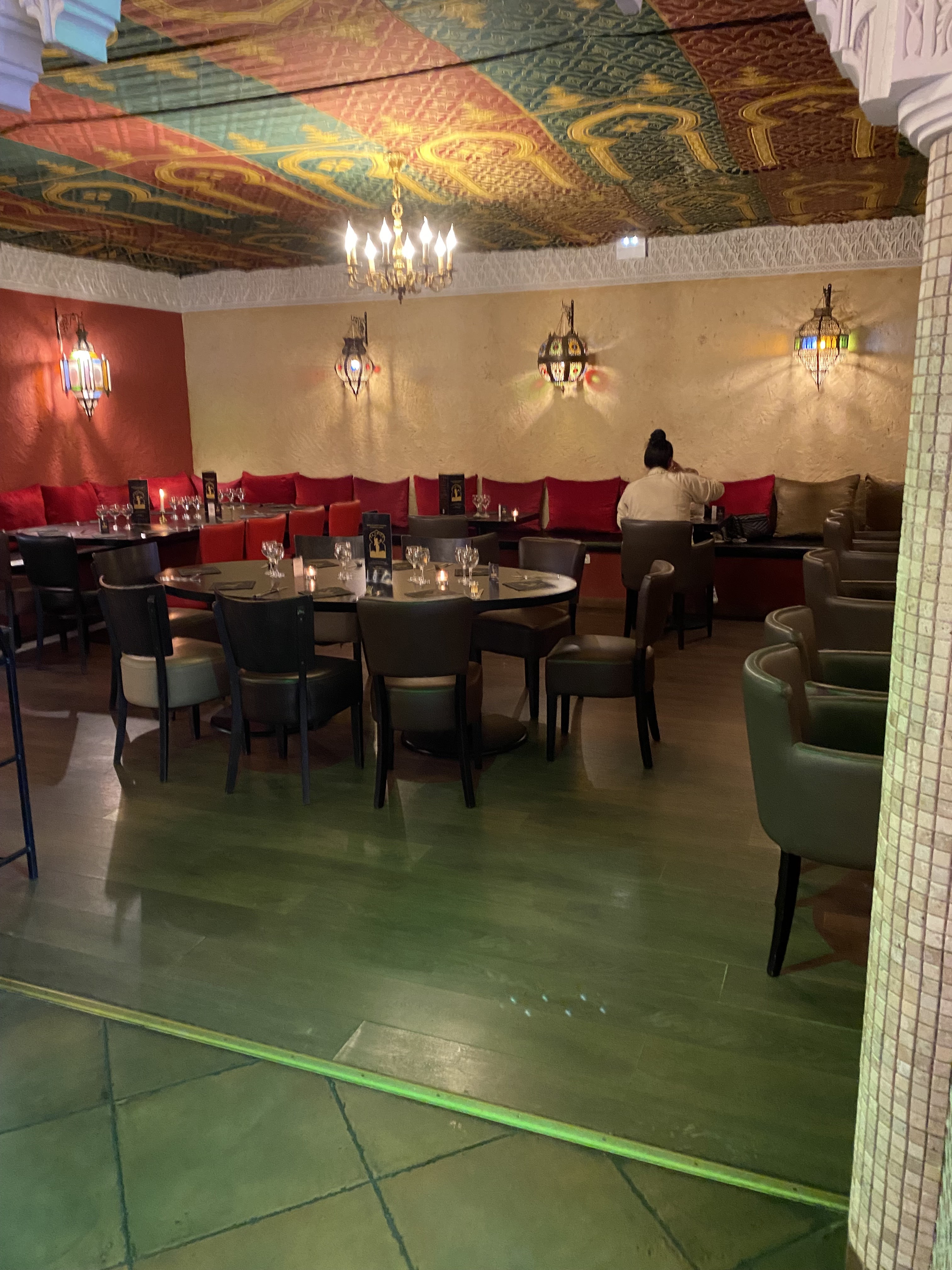 Dépaysement total. On est en immersion complète dans le Nord de l'Afrique. Les buffets salés sont exceptionnels et que dire de celui des desserts : EXCELLENT. On ne sait que choisir tellement le choix est varié. Petit plus: Le samedi soir, c'est également la Danse du ventre Je recommande ce restaurant.