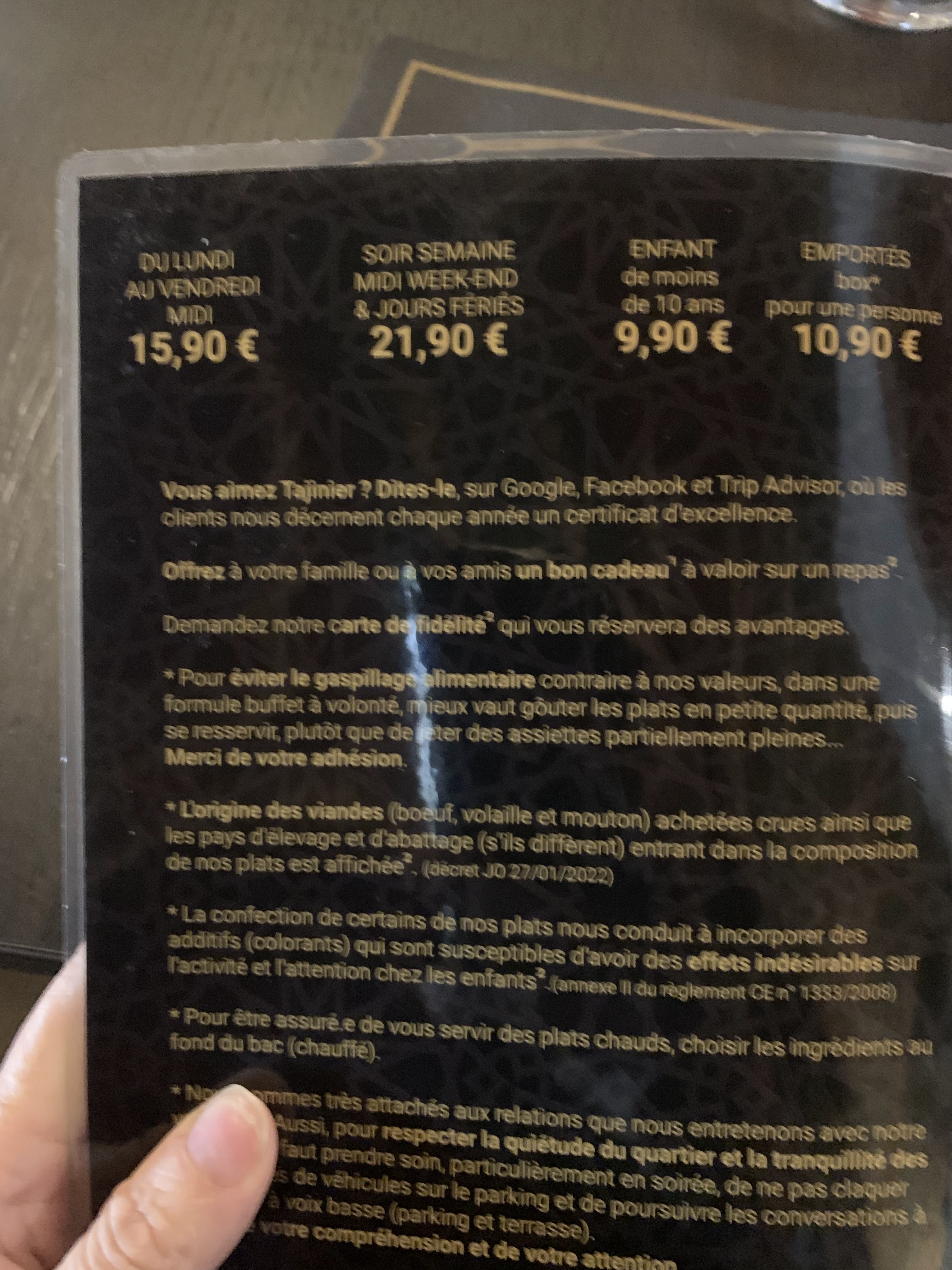 Toujours aussi bien cependant les desserts mériteraient un peu plus de finesse pour les gourmands. Monsieur Tajinier fais-nous des cornes de gazelles s'il te plaît...