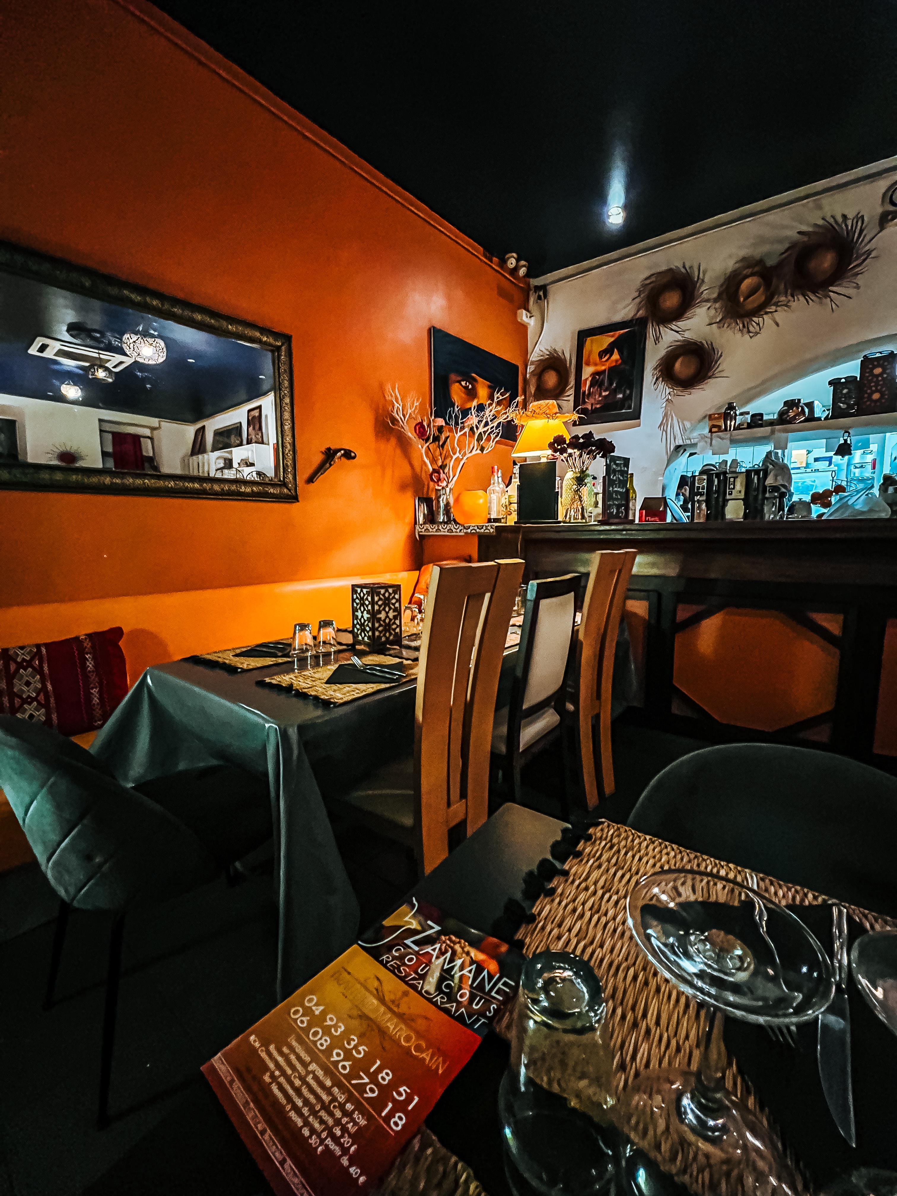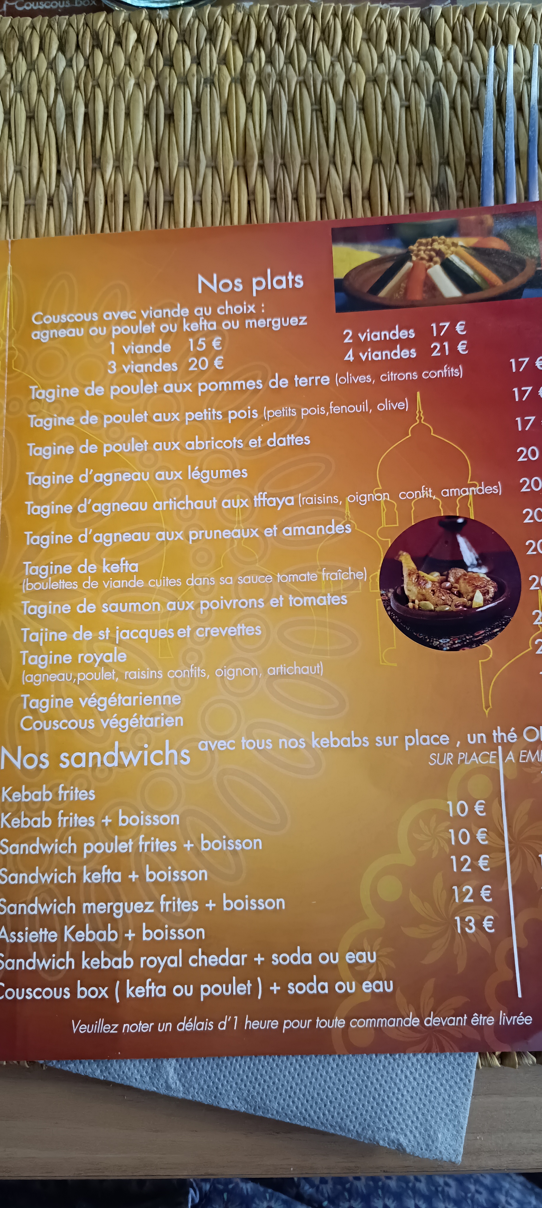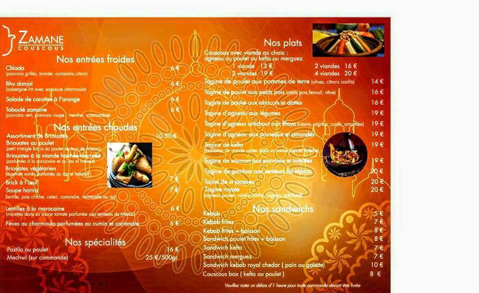 Bonjour J'ai commander 2 tajine un du pruneaux ainsi un royale. La facture 60e. Le goût ça va parcontre la quantité si trop trop radine il y'avait presque reun un morceau de poulet ainsi un morceau d'agneau il y'avait que l'ose. Malheureusement très très déçu 😞 😞. L 'ambiance froid. Je me suis fait arnaqué au niveau les prix. La facture il était même présenté. Dommage.